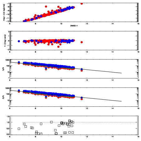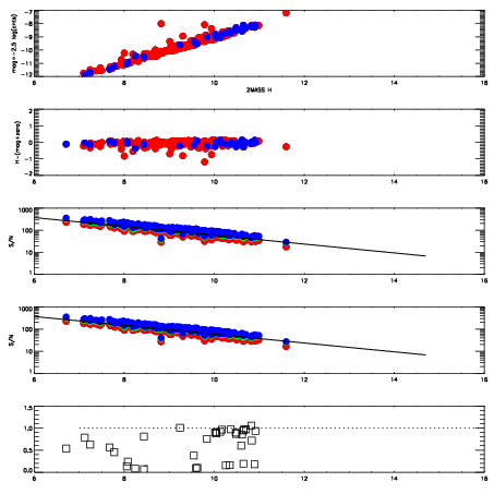 First spatial plots: circles are objects, squares are tellurics, crosses are sky fibers. Colors give deviation of observed mag from expected 2MASS mag using the median zeropoint; red is brighter