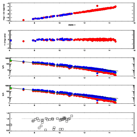 First spatial plots: circles are objects, squares are tellurics, crosses are sky fibers. Colors give deviation of observed mag from expected 2MASS mag using the median zeropoint; red is brighter