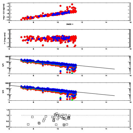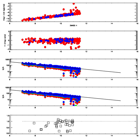 First spatial plots: circles are objects, squares are tellurics, crosses are sky fibers. Colors give deviation of observed mag from expected 2MASS mag using the median zeropoint; red is brighter