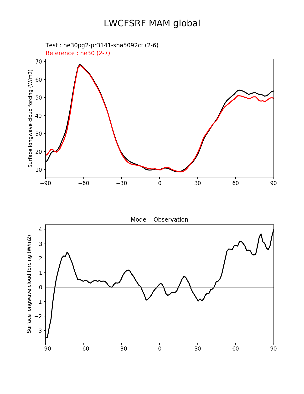 Use this command to recreate this image: | e3sm_diags --no_viewer --results_dir '/global/project/projectdirs/acme/www/ambrad/pg-ne30pg2-pr3141-sha5092cf' --variables 'LWCFSRF' --diff_colormap 'diverging_bwr.rgb' --test_colormap 'cet_rainbow.rgb' --backend 'mpl' --canvas_size_h '1628' --reference_colormap 'cet_rainbow.rgb' --reference_data_path '/global/cscratch1/sd/ambradl/acme_scratch/cori-knl/diags1/ne30' --main_title 'LWCFSRF MAM global' --test_data_path '/global/cscratch1/sd/ambradl/acme_scratch/cori-knl/diags1/ne30pg2-pr3141-sha5092cf' --regions 'global' --regrid_method 'conservative' --figsize '8.5' '11.0' --canvas_size_w '1212' --run_type 'model_vs_model' --regrid_tool 'esmf' --num_workers '4' --reference_name 'ne30' --output_format 'png' --case_id 'model_vs_model' --granulate 'variables' 'seasons' 'regions' 'plevs' --test_name 'ne30pg2-pr3141-sha5092cf' --seasons 'MAM' --arrows --selectors 'sets' 'seasons' --diff_title 'Model - Observation' --sets 'zonal_mean_xy' --dpi '150' |
