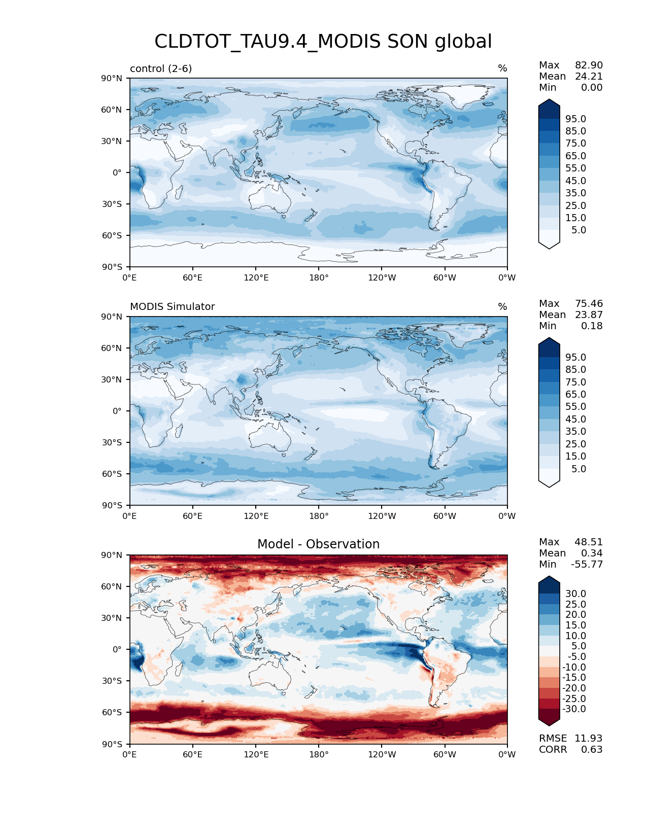 | Use this command to recreate this image: | e3sm_diags lat_lon --no_viewer --case_id 'Cloud MODIS' --sets 'lat_lon' --run_type 'model_vs_obs' --variables 'CLDTOT_TAU9.4_MODIS' --seasons 'SON' --regions 'global' --regrid_tool 'esmf' --regrid_method 'conservative' --main_title 'CLDTOT_TAU9.4_MODIS SON global' --backend 'mpl' --output_format 'png' --canvas_size_w '1212' --canvas_size_h '1628' --figsize '8.5' '11.0' --dpi '150' --arrows --contour_levels '5' '15' '25' '35' '45' '55' '65' '75' '85' '95' --test_name 'syrah.default.run_control_monthly_freq.ne30_ne30' --short_test_name 'control' --test_colormap 'Blues' --ref_name 'MODISCOSP' --reference_name 'MODIS Simulator' --reference_colormap 'Blues' --diff_title 'Model - Observation' --diff_colormap 'RdBu' --diff_levels '-30' '-25' '-20' '-15' '-10' '-5' '5' '10' '15' '20' '25' '30' --multiprocessing --num_workers '32' --granulate 'variables' 'seasons' 'plevs' 'regions' --selectors 'sets' 'seasons' --reference_data_path '/global/cfs/cdirs/e3sm/acme_diags/obs_for_e3sm_diags/climatology/' --test_data_path '/global/cscratch1/sd/beydoun/SPA_runs_from_LC/control_run/climo/rgr' --results_dir '/global/cfs/cdirs/e3sm/www/beydoun/control_vs_obs' |