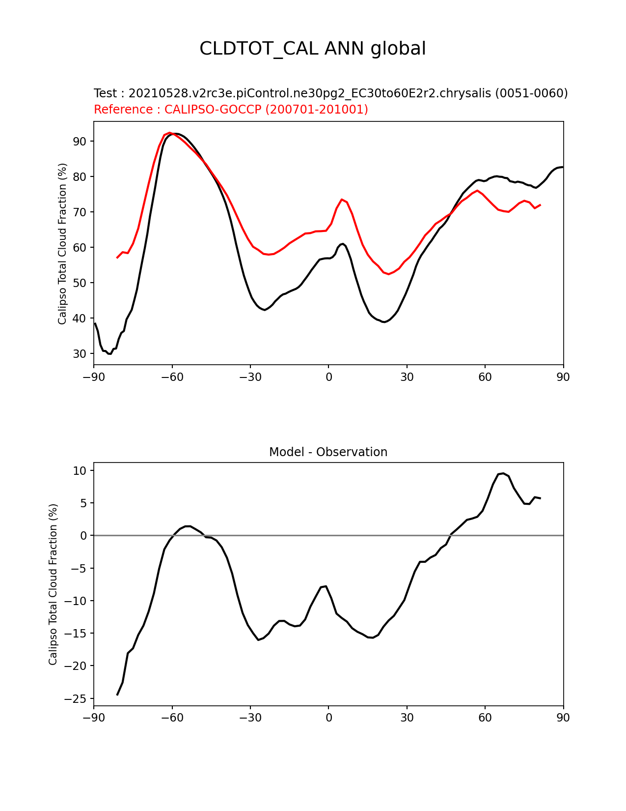 Use this command to recreate this image: | e3sm_diags zonal_mean_xy --no_viewer --reference_data_path '/global/cfs/cdirs/e3sm/diagnostics/observations/Atm/climatology' --test_data_path '/global/cfs/cdirs/e3sm/e3sm_diags/postprocessed_e3sm_v2_data_for_e3sm_diags/20210528.v2rc3e.piControl.ne30pg2_EC30to60E2r2.chrysalis/climatology/rgr/' --results_dir '/global/cfs/cdirs/e3sm/www/cdat-migration-fy24/843-migration-phase3-model-vs-obs' --case_id 'Cloud Calipso' --run_type 'model_vs_obs' --sets 'zonal_mean_xy' --variables 'CLDTOT_CAL' --seasons 'ANN' --regions 'global' --regrid_tool 'esmf' --regrid_method 'conservative' --multiprocessing --num_workers '24' --main_title 'CLDTOT_CAL ANN global' --backend 'cartopy' --save_netcdf --output_format 'png' --canvas_size_w '1212' --canvas_size_h '1628' --figsize '8.5' '11.0' --dpi '150' --arrows --test_name '20210528.v2rc3e.piControl.ne30pg2_EC30to60E2r2.chrysalis' --test_colormap 'cet_rainbow.rgb' --ref_name 'CALIPSOCOSP' --reference_name 'CALIPSO-GOCCP' --reference_colormap 'cet_rainbow.rgb' --diff_title 'Model - Observation' --diff_colormap 'diverging_bwr.rgb' --granulate 'variables' 'seasons' 'plevs' 'regions' --selectors 'sets' 'seasons' |