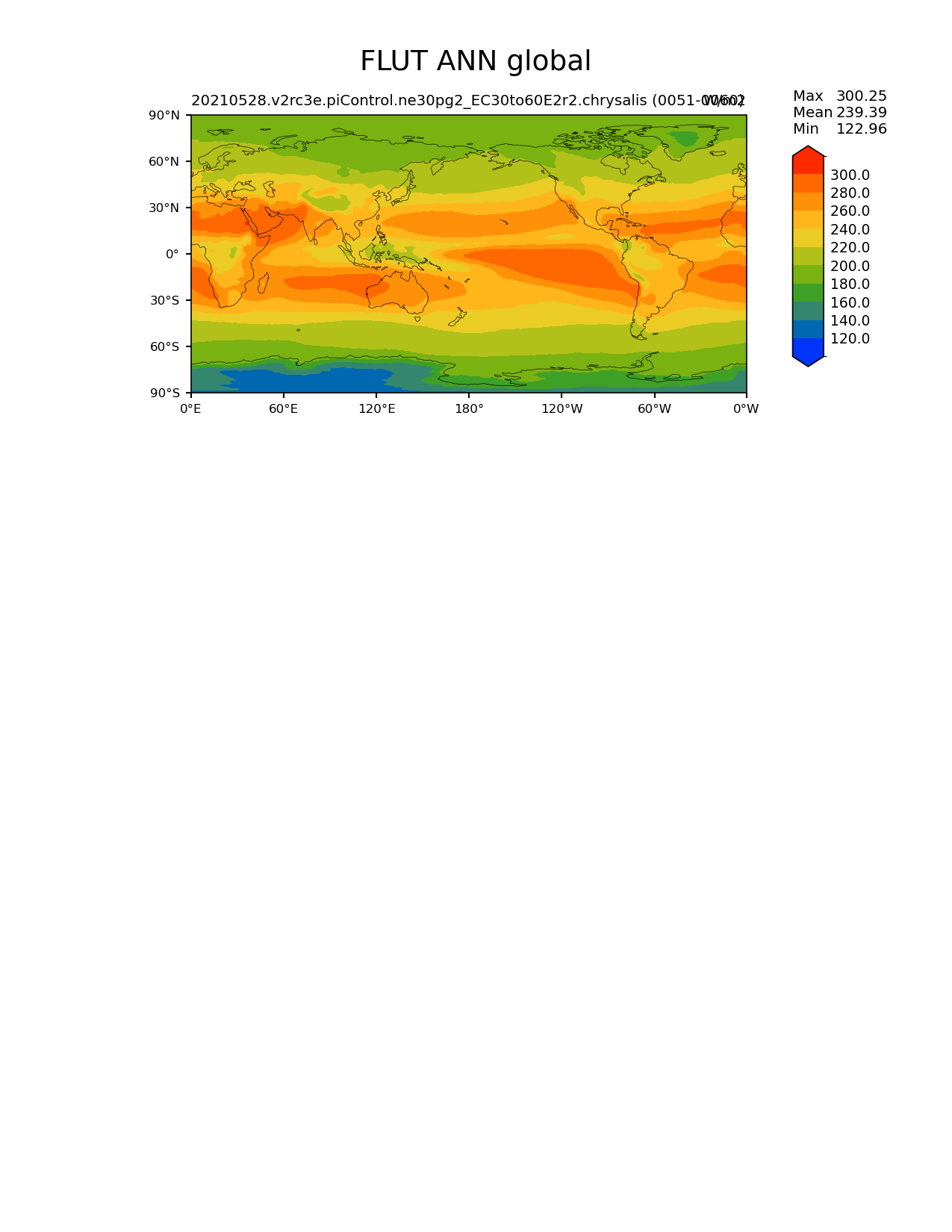 Use this command to recreate this image: | e3sm_diags lat_lon --no_viewer --reference_data_path '/global/cfs/cdirs/e3sm/diagnostics/observations/Atm/climatology' --test_data_path '/global/cfs/cdirs/e3sm/e3sm_diags/postprocessed_e3sm_v2_data_for_e3sm_diags/20210528.v2rc3e.piControl.ne30pg2_EC30to60E2r2.chrysalis/climatology/rgr/' --results_dir '/global/cfs/cdirs/e3sm/www/cdat-migration-fy24/main/v2_9_0_all_sets_model_vs_model' --case_id 'model_vs_model' --run_type 'model_vs_model' --sets 'lat_lon' --variables 'FLUT' --seasons 'ANN' --regions 'global' --regrid_tool 'esmf' --regrid_method 'conservative' --multiprocessing --num_workers '24' --main_title 'FLUT ANN global' --backend 'mpl' --save_netcdf --output_format 'png' --canvas_size_w '1212' --canvas_size_h '1628' --figsize '8.5' '11.0' --dpi '150' --arrows --contour_levels '120' '140' '160' '180' '200' '220' '240' '260' '280' '300' --test_name '20210528.v2rc3e.piControl.ne30pg2_EC30to60E2r2.chrysalis' --test_colormap 'cet_rainbow.rgb' --reference_colormap 'cet_rainbow.rgb' --diff_title 'Model - Observation' --diff_colormap 'diverging_bwr.rgb' --diff_levels '-30' '-25' '-20' '-15' '-10' '-5' '-2' '2' '5' '10' '15' '20' '25' '30' --granulate 'variables' 'seasons' 'plevs' 'regions' --selectors 'sets' 'seasons' |