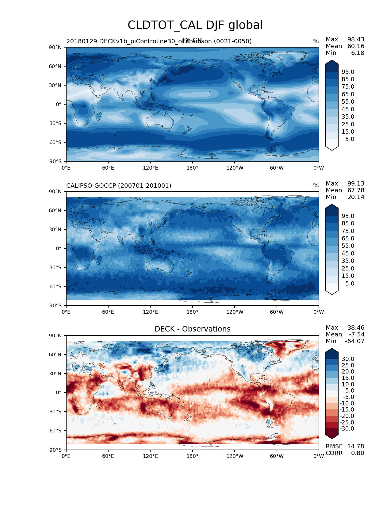 Use this command to recreate this image: | e3sm_diags --no_viewer --sets 'lat_lon' --case_id 'Cloud Calipso' --variables 'CLDTOT_CAL' --ref_name 'CALIPSOCOSP' --reference_name 'CALIPSO-GOCCP' --seasons 'DJF' --test_colormap 'Blues' --reference_colormap 'Blues' --diff_colormap 'RdBu' --contour_levels '5' '15' '25' '35' '45' '55' '65' '75' '85' '95' --diff_levels '-30' '-25' '-20' '-15' '-10' '-5' '5' '10' '15' '20' '25' '30' --run_type 'model_vs_obs' --regions 'global' --regrid_tool 'esmf' --regrid_method 'conservative' --main_title 'CLDTOT_CAL DJF global' --backend 'mpl' --save_netcdf --output_format 'png' --output_format_subplot 'pdf' --canvas_size_w '1212' --canvas_size_h '1628' --figsize '8.5' '11.0' --dpi '150' --arrows --test_name '20180129.DECKv1b_piControl.ne30_oEC.edison' --test_title 'DECK' --diff_title 'DECK - Observations' --multiprocessing --num_workers '16' --granulate 'variables' 'seasons' 'regions' 'plevs' --selectors 'sets' 'seasons' --reference_data_path '/global/project/projectdirs/acme/acme_diags/obs_for_e3sm_diags/climatology/' --results_dir '/global/cscratch1/sd/golaz/E3SM/paper_HR/e3sm_diags/v1-LR/' --test_data_path '/global/cscratch1/sd/acmedata/E3SM_simulations/20180129.DECKv1b_piControl.ne30_oEC.edison/atm/mon_180x360/' |