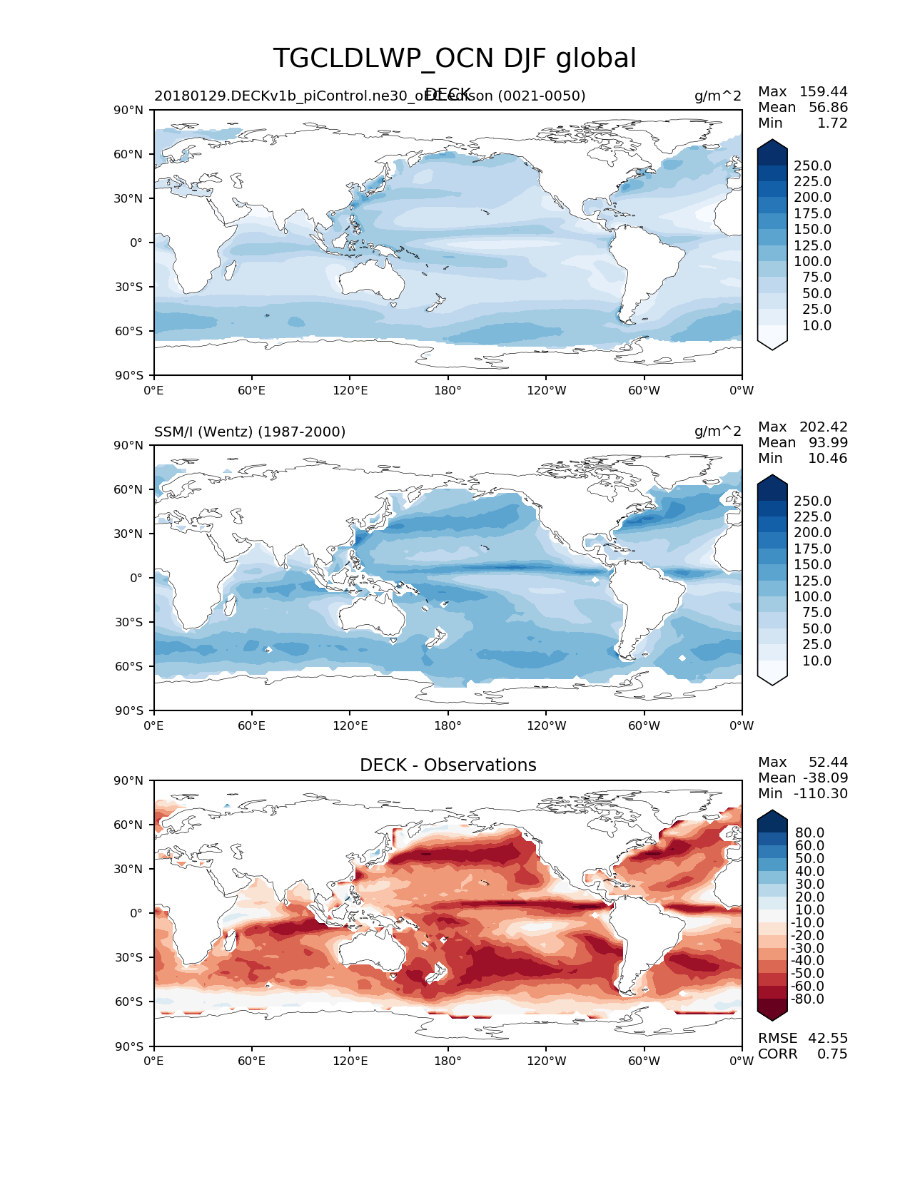 Use this command to recreate this image: | e3sm_diags --no_viewer --sets 'lat_lon' --case_id 'Cloud SSM/I' --variables 'TGCLDLWP_OCN' --ref_name 'SSMI' --reference_name 'SSM/I (Wentz)' --seasons 'DJF' --test_colormap 'Blues' --reference_colormap 'Blues' --diff_colormap 'RdBu' --contour_levels '10' '25' '50' '75' '100' '125' '150' '175' '200' '225' '250' --diff_levels '-80' '-60' '-50' '-40' '-30' '-20' '-10' '10' '20' '30' '40' '50' '60' '80' --run_type 'model_vs_obs' --regions 'global' --regrid_tool 'esmf' --regrid_method 'conservative' --main_title 'TGCLDLWP_OCN DJF global' --backend 'mpl' --save_netcdf --output_format 'png' --output_format_subplot 'pdf' --canvas_size_w '1212' --canvas_size_h '1628' --figsize '8.5' '11.0' --dpi '150' --arrows --test_name '20180129.DECKv1b_piControl.ne30_oEC.edison' --test_title 'DECK' --diff_title 'DECK - Observations' --multiprocessing --num_workers '16' --granulate 'variables' 'seasons' 'regions' 'plevs' --selectors 'sets' 'seasons' --reference_data_path '/global/project/projectdirs/acme/acme_diags/obs_for_e3sm_diags/climatology/' --results_dir '/global/cscratch1/sd/golaz/E3SM/paper_HR/e3sm_diags/v1-LR/' --test_data_path '/global/cscratch1/sd/acmedata/E3SM_simulations/20180129.DECKv1b_piControl.ne30_oEC.edison/atm/mon_180x360/' |