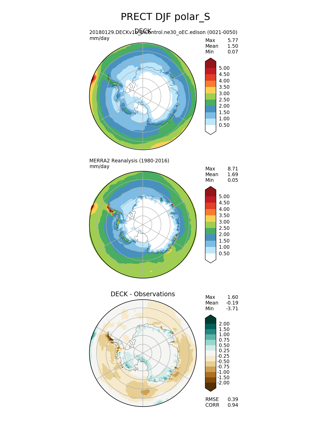Use this command to recreate this image: | e3sm_diags --no_viewer --sets 'polar' --case_id 'MERRA2' --variables 'PRECT' --ref_name 'MERRA2' --reference_name 'MERRA2 Reanalysis' --seasons 'DJF' --regions 'polar_S' --test_colormap 'WhiteBlueGreenYellowRed.rgb' --reference_colormap 'WhiteBlueGreenYellowRed.rgb' --diff_colormap 'BrBG' --contour_levels '0.5' '1' '1.5' '2' '2.5' '3' '3.5' '4' '4.5' '5' --diff_levels '-2' '-1.5' '-1' '-0.75' '-0.5' '-0.25' '0.25' '0.5' '0.75' '1' '1.5' '2' --run_type 'model_vs_obs' --regrid_tool 'esmf' --regrid_method 'conservative' --main_title 'PRECT DJF polar_S' --backend 'mpl' --save_netcdf --output_format 'png' --output_format_subplot 'pdf' --canvas_size_w '1212' --canvas_size_h '1628' --figsize '8.5' '11.0' --dpi '150' --arrows --test_name '20180129.DECKv1b_piControl.ne30_oEC.edison' --test_title 'DECK' --diff_title 'DECK - Observations' --multiprocessing --num_workers '16' --granulate 'variables' 'seasons' 'regions' 'plevs' --selectors 'sets' 'seasons' --reference_data_path '/global/project/projectdirs/acme/acme_diags/obs_for_e3sm_diags/climatology/' --results_dir '/global/cscratch1/sd/golaz/E3SM/paper_HR/e3sm_diags/v1-LR/' --test_data_path '/global/cscratch1/sd/acmedata/E3SM_simulations/20180129.DECKv1b_piControl.ne30_oEC.edison/atm/mon_180x360/' |
