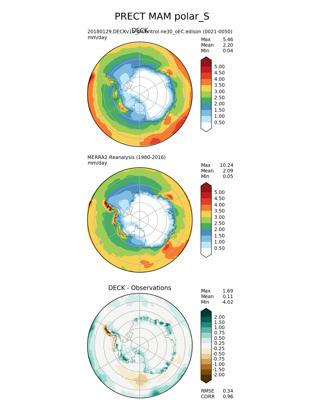 Use this command to recreate this image: | e3sm_diags --no_viewer --sets 'polar' --case_id 'MERRA2' --variables 'PRECT' --ref_name 'MERRA2' --reference_name 'MERRA2 Reanalysis' --seasons 'MAM' --regions 'polar_S' --test_colormap 'WhiteBlueGreenYellowRed.rgb' --reference_colormap 'WhiteBlueGreenYellowRed.rgb' --diff_colormap 'BrBG' --contour_levels '0.5' '1' '1.5' '2' '2.5' '3' '3.5' '4' '4.5' '5' --diff_levels '-2' '-1.5' '-1' '-0.75' '-0.5' '-0.25' '0.25' '0.5' '0.75' '1' '1.5' '2' --run_type 'model_vs_obs' --regrid_tool 'esmf' --regrid_method 'conservative' --main_title 'PRECT MAM polar_S' --backend 'mpl' --save_netcdf --output_format 'png' --output_format_subplot 'pdf' --canvas_size_w '1212' --canvas_size_h '1628' --figsize '8.5' '11.0' --dpi '150' --arrows --test_name '20180129.DECKv1b_piControl.ne30_oEC.edison' --test_title 'DECK' --diff_title 'DECK - Observations' --multiprocessing --num_workers '16' --granulate 'variables' 'seasons' 'regions' 'plevs' --selectors 'sets' 'seasons' --reference_data_path '/global/project/projectdirs/acme/acme_diags/obs_for_e3sm_diags/climatology/' --results_dir '/global/cscratch1/sd/golaz/E3SM/paper_HR/e3sm_diags/v1-LR/' --test_data_path '/global/cscratch1/sd/acmedata/E3SM_simulations/20180129.DECKv1b_piControl.ne30_oEC.edison/atm/mon_180x360/' |