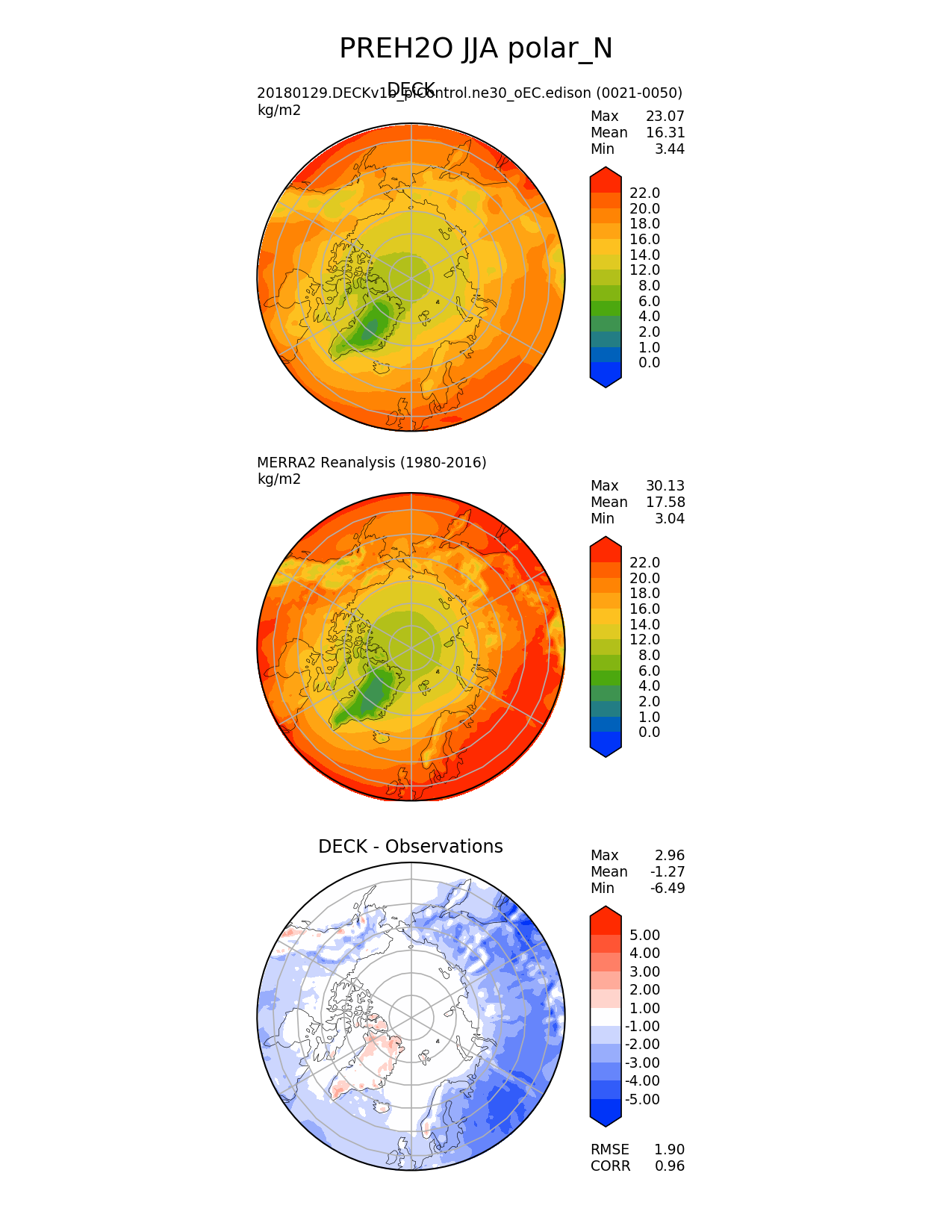 Use this command to recreate this image: | e3sm_diags --no_viewer --sets 'polar' --case_id 'MERRA2' --variables 'PREH2O' --ref_name 'MERRA2' --reference_name 'MERRA2 Reanalysis' --seasons 'JJA' --regions 'polar_N' --contour_levels '0' '1' '2' '4' '6' '8' '12' '14' '16' '18' '20' '22' --diff_levels '-5' '-4' '-3' '-2' '-1' '1' '2' '3' '4' '5' --run_type 'model_vs_obs' --regrid_tool 'esmf' --regrid_method 'conservative' --main_title 'PREH2O JJA polar_N' --backend 'mpl' --save_netcdf --output_format 'png' --output_format_subplot 'pdf' --canvas_size_w '1212' --canvas_size_h '1628' --figsize '8.5' '11.0' --dpi '150' --arrows --test_name '20180129.DECKv1b_piControl.ne30_oEC.edison' --test_title 'DECK' --test_colormap 'cet_rainbow.rgb' --reference_colormap 'cet_rainbow.rgb' --diff_title 'DECK - Observations' --diff_colormap 'diverging_bwr.rgb' --multiprocessing --num_workers '16' --granulate 'variables' 'seasons' 'regions' 'plevs' --selectors 'sets' 'seasons' --reference_data_path '/global/project/projectdirs/acme/acme_diags/obs_for_e3sm_diags/climatology/' --results_dir '/global/cscratch1/sd/golaz/E3SM/paper_HR/e3sm_diags/v1-LR/' --test_data_path '/global/cscratch1/sd/acmedata/E3SM_simulations/20180129.DECKv1b_piControl.ne30_oEC.edison/atm/mon_180x360/' |
