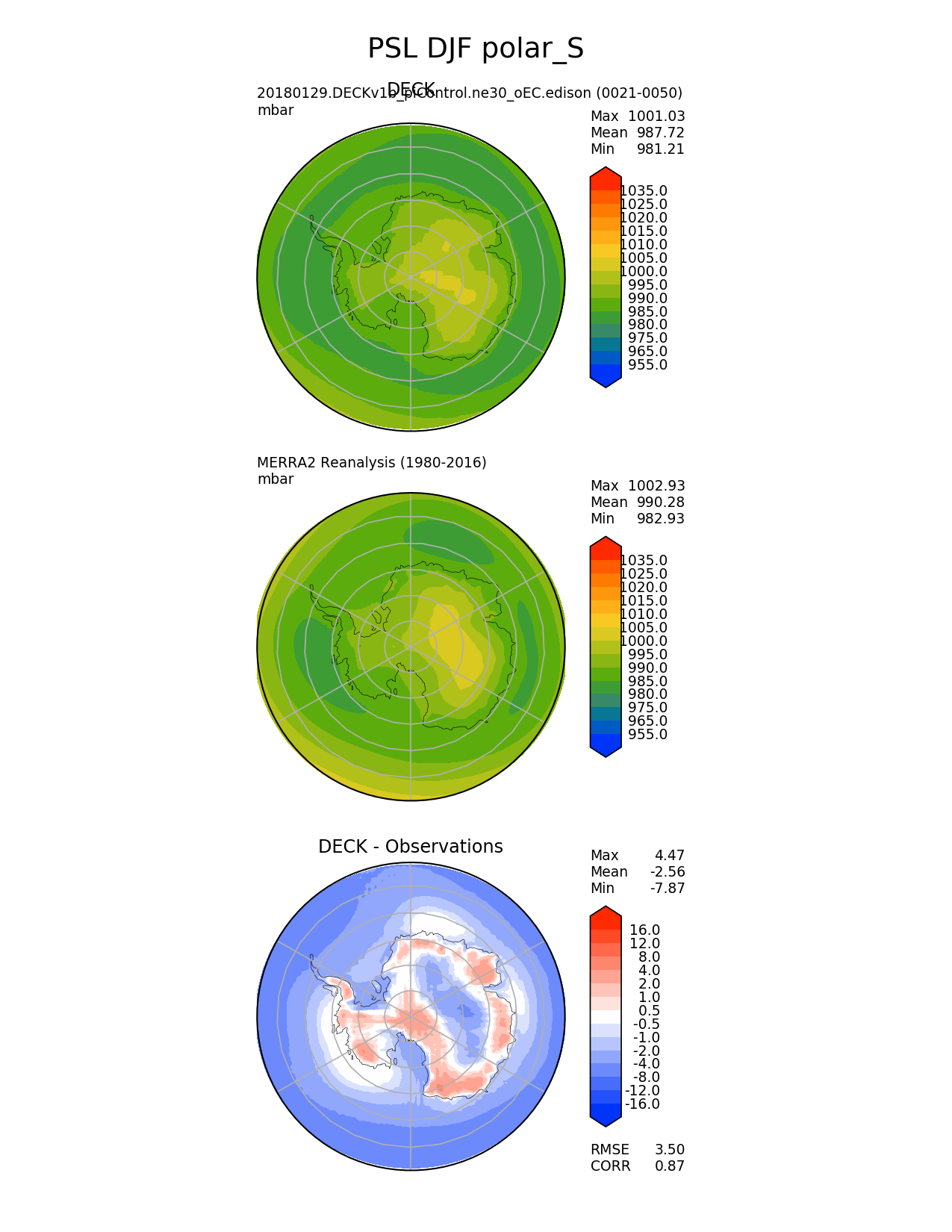 Use this command to recreate this image: | e3sm_diags --no_viewer --sets 'polar' --case_id 'MERRA2' --variables 'PSL' --ref_name 'MERRA2' --reference_name 'MERRA2 Reanalysis' --regions 'polar_S' --seasons 'DJF' --contour_levels '955' '965' '975' '980' '985' '990' '995' '1000' '1005' '1010' '1015' '1020' '1025' '1035' --diff_levels '-16' '-12' '-8' '-4' '-2' '-1' '-0.5' '0.5' '1' '2' '4' '8' '12' '16' --run_type 'model_vs_obs' --regrid_tool 'esmf' --regrid_method 'conservative' --main_title 'PSL DJF polar_S' --backend 'mpl' --save_netcdf --output_format 'png' --output_format_subplot 'pdf' --canvas_size_w '1212' --canvas_size_h '1628' --figsize '8.5' '11.0' --dpi '150' --arrows --test_name '20180129.DECKv1b_piControl.ne30_oEC.edison' --test_title 'DECK' --test_colormap 'cet_rainbow.rgb' --reference_colormap 'cet_rainbow.rgb' --diff_title 'DECK - Observations' --diff_colormap 'diverging_bwr.rgb' --multiprocessing --num_workers '16' --granulate 'variables' 'seasons' 'regions' 'plevs' --selectors 'sets' 'seasons' --reference_data_path '/global/project/projectdirs/acme/acme_diags/obs_for_e3sm_diags/climatology/' --results_dir '/global/cscratch1/sd/golaz/E3SM/paper_HR/e3sm_diags/v1-LR/' --test_data_path '/global/cscratch1/sd/acmedata/E3SM_simulations/20180129.DECKv1b_piControl.ne30_oEC.edison/atm/mon_180x360/' |