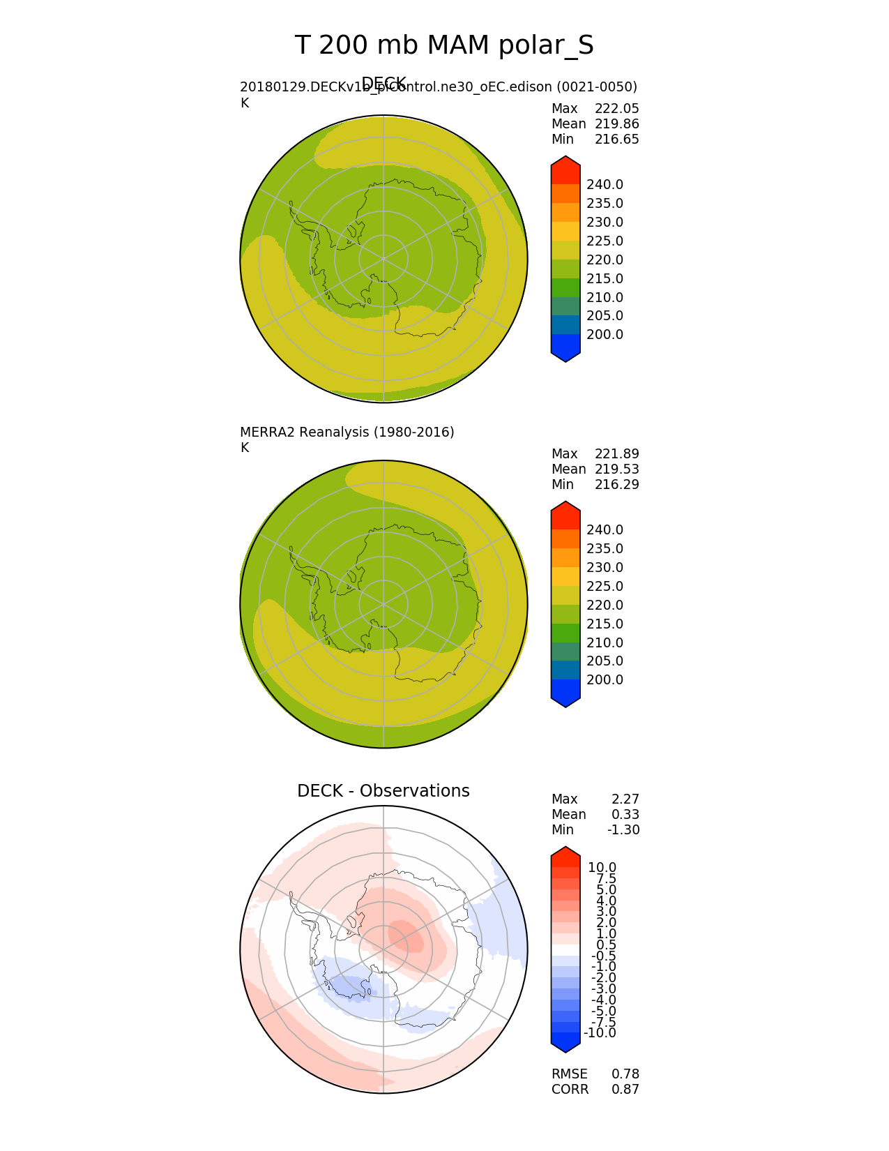 Use this command to recreate this image: | e3sm_diags --no_viewer --sets 'polar' --case_id 'MERRA2' --variables 'T' --ref_name 'MERRA2' --reference_name 'MERRA2 Reanalysis' --seasons 'MAM' --regions 'polar_S' --plevs '200.0' --contour_levels '200' '205' '210' '215' '220' '225' '230' '235' '240' --diff_levels '-10' '-7.5' '-5' '-4' '-3' '-2' '-1' '-0.5' '0.5' '1' '2' '3' '4' '5' '7.5' '10' --run_type 'model_vs_obs' --regrid_tool 'esmf' --regrid_method 'conservative' --main_title 'T 200 mb MAM polar_S' --backend 'mpl' --save_netcdf --output_format 'png' --output_format_subplot 'pdf' --canvas_size_w '1212' --canvas_size_h '1628' --figsize '8.5' '11.0' --dpi '150' --arrows --test_name '20180129.DECKv1b_piControl.ne30_oEC.edison' --test_title 'DECK' --test_colormap 'cet_rainbow.rgb' --reference_colormap 'cet_rainbow.rgb' --diff_title 'DECK - Observations' --diff_colormap 'diverging_bwr.rgb' --multiprocessing --num_workers '16' --granulate 'variables' 'seasons' 'regions' 'plevs' --selectors 'sets' 'seasons' --reference_data_path '/global/project/projectdirs/acme/acme_diags/obs_for_e3sm_diags/climatology/' --results_dir '/global/cscratch1/sd/golaz/E3SM/paper_HR/e3sm_diags/v1-LR/' --test_data_path '/global/cscratch1/sd/acmedata/E3SM_simulations/20180129.DECKv1b_piControl.ne30_oEC.edison/atm/mon_180x360/' |