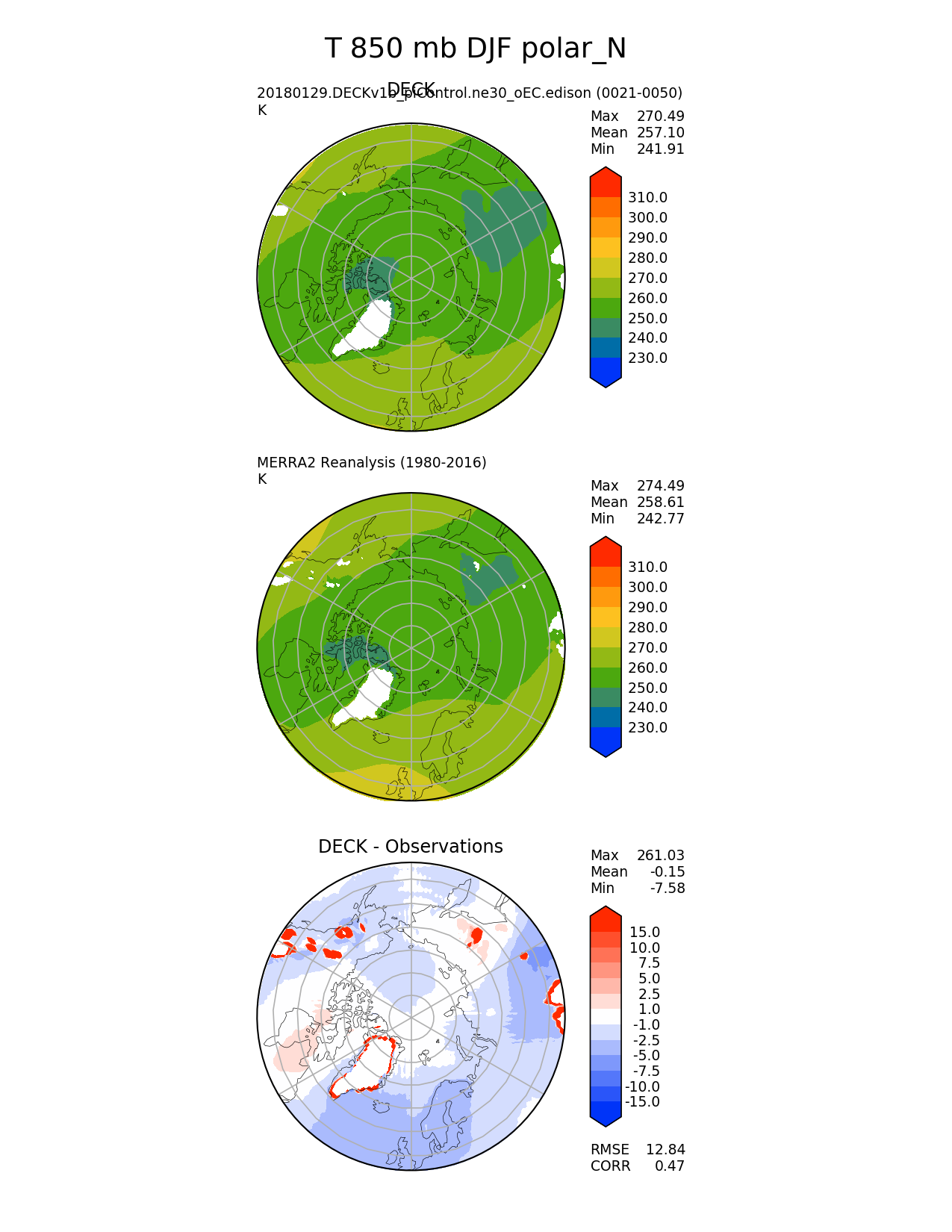 Use this command to recreate this image: | e3sm_diags --no_viewer --sets 'polar' --case_id 'MERRA2' --variables 'T' --ref_name 'MERRA2' --reference_name 'MERRA2 Reanalysis' --seasons 'DJF' --regions 'polar_N' --plevs '850.0' --contour_levels '230' '240' '250' '260' '270' '280' '290' '300' '310' --diff_levels '-15' '-10' '-7.5' '-5' '-2.5' '-1' '1' '2.5' '5' '7.5' '10' '15' --run_type 'model_vs_obs' --regrid_tool 'esmf' --regrid_method 'conservative' --main_title 'T 850 mb DJF polar_N' --backend 'mpl' --save_netcdf --output_format 'png' --output_format_subplot 'pdf' --canvas_size_w '1212' --canvas_size_h '1628' --figsize '8.5' '11.0' --dpi '150' --arrows --test_name '20180129.DECKv1b_piControl.ne30_oEC.edison' --test_title 'DECK' --test_colormap 'cet_rainbow.rgb' --reference_colormap 'cet_rainbow.rgb' --diff_title 'DECK - Observations' --diff_colormap 'diverging_bwr.rgb' --multiprocessing --num_workers '16' --granulate 'variables' 'seasons' 'regions' 'plevs' --selectors 'sets' 'seasons' --reference_data_path '/global/project/projectdirs/acme/acme_diags/obs_for_e3sm_diags/climatology/' --results_dir '/global/cscratch1/sd/golaz/E3SM/paper_HR/e3sm_diags/v1-LR/' --test_data_path '/global/cscratch1/sd/acmedata/E3SM_simulations/20180129.DECKv1b_piControl.ne30_oEC.edison/atm/mon_180x360/' |