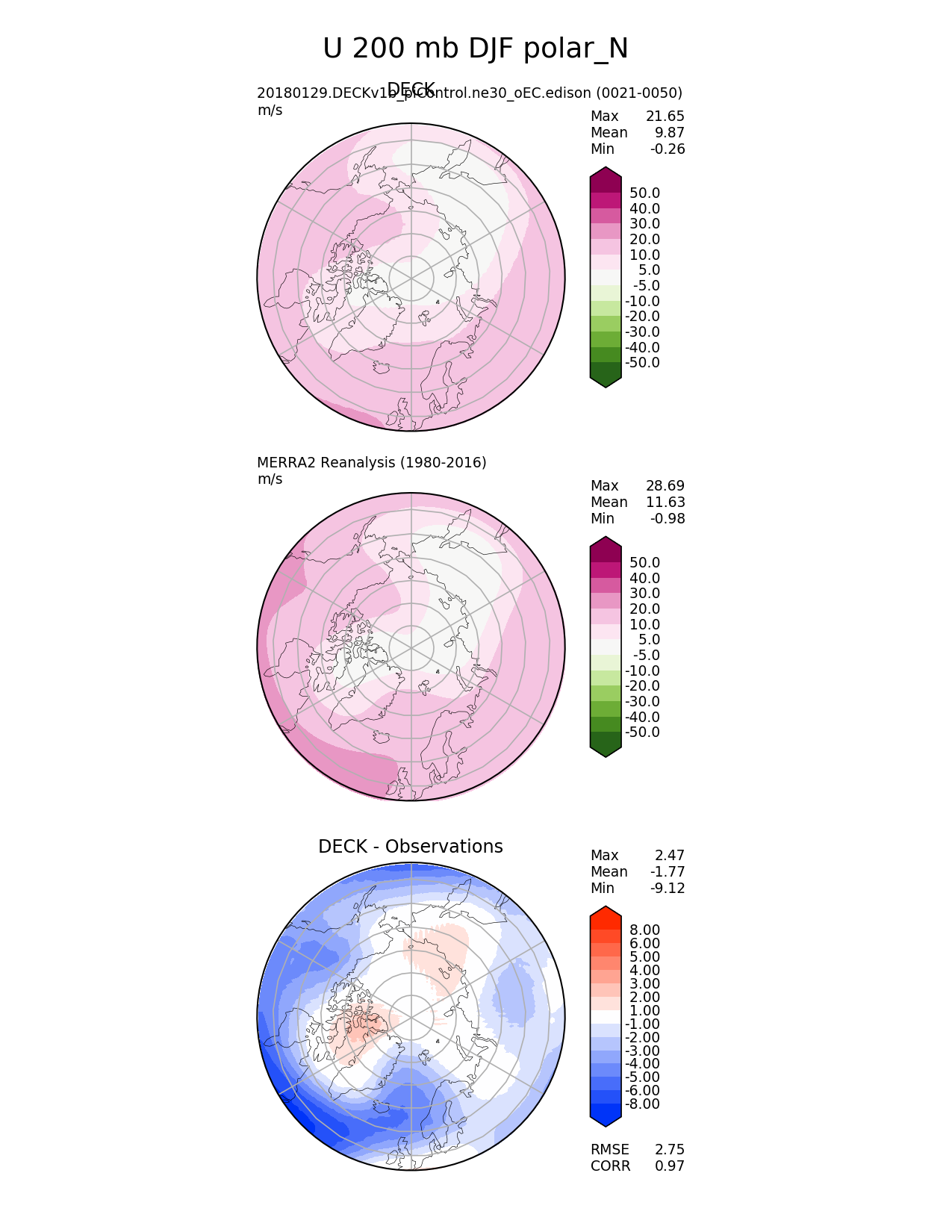 Use this command to recreate this image: | e3sm_diags --no_viewer --sets 'polar' --case_id 'MERRA2' --variables 'U' --ref_name 'MERRA2' --reference_name 'MERRA2 Reanalysis' --seasons 'DJF' --regions 'polar_N' --plevs '200.0' --test_colormap 'PiYG_r' --reference_colormap 'PiYG_r' --contour_levels '-50' '-40' '-30' '-20' '-10' '-5' '5' '10' '20' '30' '40' '50' --diff_levels '-8' '-6' '-5' '-4' '-3' '-2' '-1' '1' '2' '3' '4' '5' '6' '8' --run_type 'model_vs_obs' --regrid_tool 'esmf' --regrid_method 'conservative' --main_title 'U 200 mb DJF polar_N' --backend 'mpl' --save_netcdf --output_format 'png' --output_format_subplot 'pdf' --canvas_size_w '1212' --canvas_size_h '1628' --figsize '8.5' '11.0' --dpi '150' --arrows --test_name '20180129.DECKv1b_piControl.ne30_oEC.edison' --test_title 'DECK' --diff_title 'DECK - Observations' --diff_colormap 'diverging_bwr.rgb' --multiprocessing --num_workers '16' --granulate 'variables' 'seasons' 'regions' 'plevs' --selectors 'sets' 'seasons' --reference_data_path '/global/project/projectdirs/acme/acme_diags/obs_for_e3sm_diags/climatology/' --results_dir '/global/cscratch1/sd/golaz/E3SM/paper_HR/e3sm_diags/v1-LR/' --test_data_path '/global/cscratch1/sd/acmedata/E3SM_simulations/20180129.DECKv1b_piControl.ne30_oEC.edison/atm/mon_180x360/' |