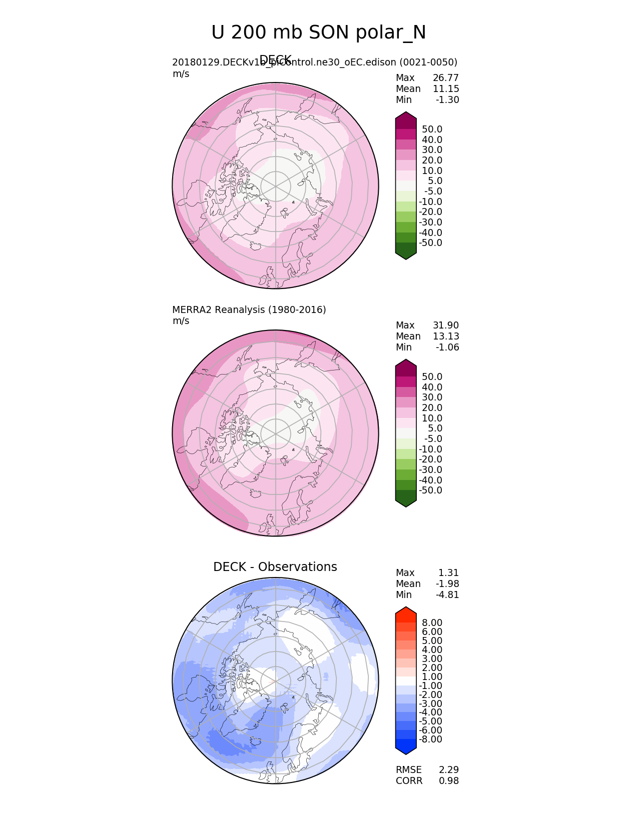 Use this command to recreate this image: | e3sm_diags --no_viewer --sets 'polar' --case_id 'MERRA2' --variables 'U' --ref_name 'MERRA2' --reference_name 'MERRA2 Reanalysis' --seasons 'SON' --regions 'polar_N' --plevs '200.0' --test_colormap 'PiYG_r' --reference_colormap 'PiYG_r' --contour_levels '-50' '-40' '-30' '-20' '-10' '-5' '5' '10' '20' '30' '40' '50' --diff_levels '-8' '-6' '-5' '-4' '-3' '-2' '-1' '1' '2' '3' '4' '5' '6' '8' --run_type 'model_vs_obs' --regrid_tool 'esmf' --regrid_method 'conservative' --main_title 'U 200 mb SON polar_N' --backend 'mpl' --save_netcdf --output_format 'png' --output_format_subplot 'pdf' --canvas_size_w '1212' --canvas_size_h '1628' --figsize '8.5' '11.0' --dpi '150' --arrows --test_name '20180129.DECKv1b_piControl.ne30_oEC.edison' --test_title 'DECK' --diff_title 'DECK - Observations' --diff_colormap 'diverging_bwr.rgb' --multiprocessing --num_workers '16' --granulate 'variables' 'seasons' 'regions' 'plevs' --selectors 'sets' 'seasons' --reference_data_path '/global/project/projectdirs/acme/acme_diags/obs_for_e3sm_diags/climatology/' --results_dir '/global/cscratch1/sd/golaz/E3SM/paper_HR/e3sm_diags/v1-LR/' --test_data_path '/global/cscratch1/sd/acmedata/E3SM_simulations/20180129.DECKv1b_piControl.ne30_oEC.edison/atm/mon_180x360/' |