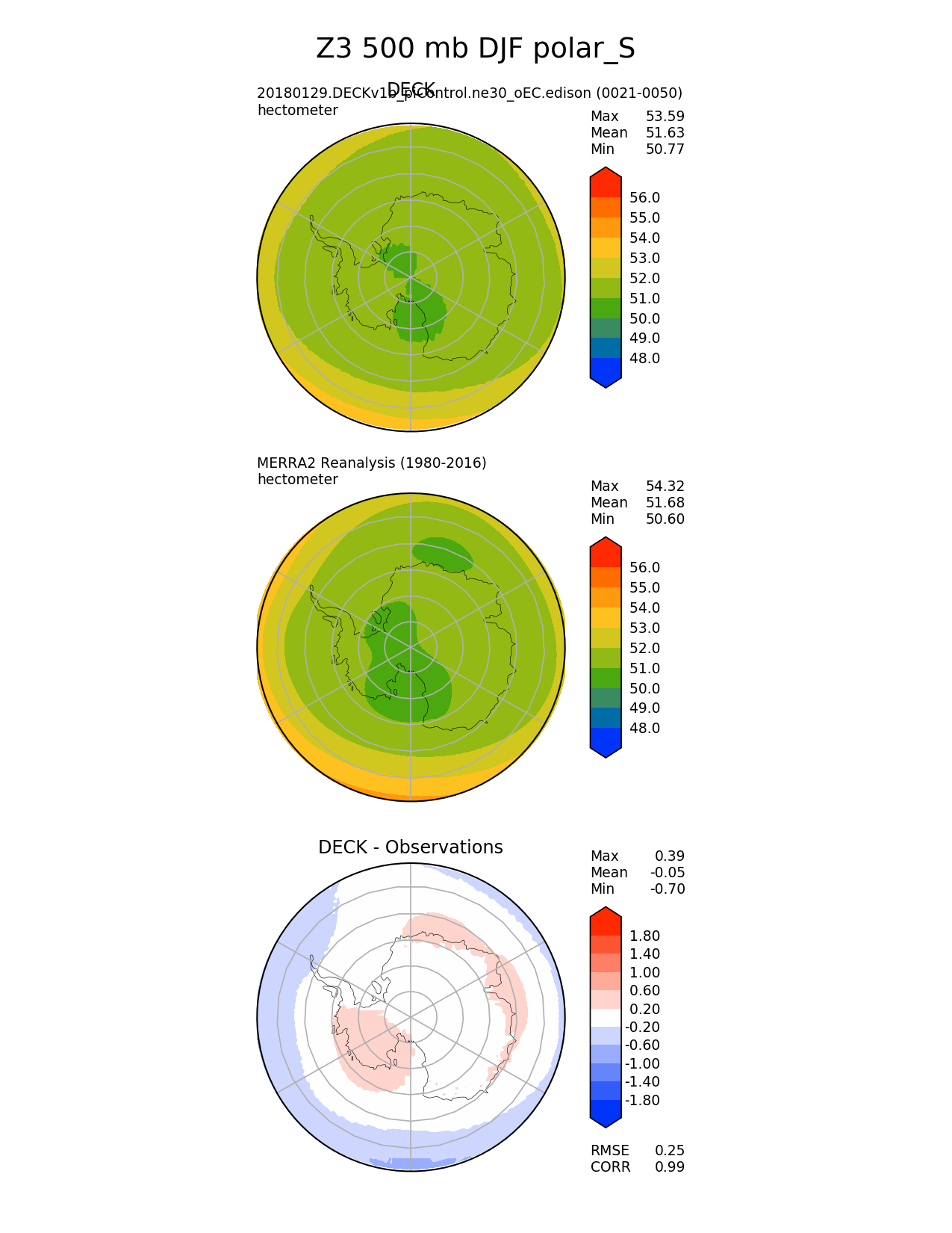 Use this command to recreate this image: | e3sm_diags --no_viewer --sets 'polar' --case_id 'MERRA2' --variables 'Z3' --ref_name 'MERRA2' --reference_name 'MERRA2 Reanalysis' --seasons 'DJF' --regions 'polar_S' --plevs '500.0' --contour_levels '48' '49' '50' '51' '52' '53' '54' '55' '56' --diff_levels '-1.8' '-1.4' '-1.0' '-0.6' '-0.2' '0.2' '0.6' '1.0' '1.4' '1.8' --run_type 'model_vs_obs' --regrid_tool 'esmf' --regrid_method 'conservative' --main_title 'Z3 500 mb DJF polar_S' --backend 'mpl' --save_netcdf --output_format 'png' --output_format_subplot 'pdf' --canvas_size_w '1212' --canvas_size_h '1628' --figsize '8.5' '11.0' --dpi '150' --arrows --test_name '20180129.DECKv1b_piControl.ne30_oEC.edison' --test_title 'DECK' --test_colormap 'cet_rainbow.rgb' --reference_colormap 'cet_rainbow.rgb' --diff_title 'DECK - Observations' --diff_colormap 'diverging_bwr.rgb' --multiprocessing --num_workers '16' --granulate 'variables' 'seasons' 'regions' 'plevs' --selectors 'sets' 'seasons' --reference_data_path '/global/project/projectdirs/acme/acme_diags/obs_for_e3sm_diags/climatology/' --results_dir '/global/cscratch1/sd/golaz/E3SM/paper_HR/e3sm_diags/v1-LR/' --test_data_path '/global/cscratch1/sd/acmedata/E3SM_simulations/20180129.DECKv1b_piControl.ne30_oEC.edison/atm/mon_180x360/' |