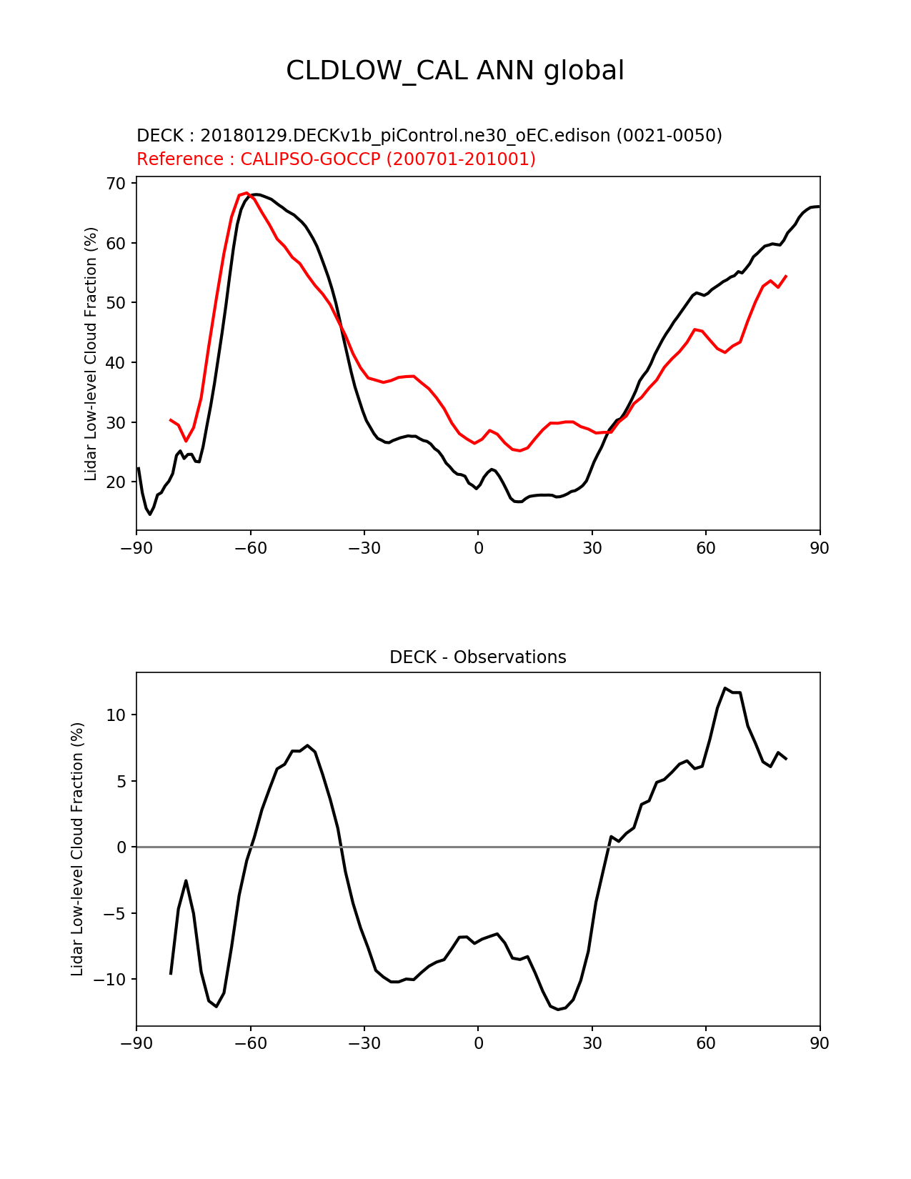 Use this command to recreate this image: | e3sm_diags --no_viewer --sets 'zonal_mean_xy' --case_id 'Cloud Calipso' --variables 'CLDLOW_CAL' --ref_name 'CALIPSOCOSP' --reference_name 'CALIPSO-GOCCP' --seasons 'ANN' --run_type 'model_vs_obs' --regions 'global' --regrid_tool 'esmf' --regrid_method 'conservative' --main_title 'CLDLOW_CAL ANN global' --backend 'mpl' --save_netcdf --output_format 'png' --output_format_subplot 'pdf' --canvas_size_w '1212' --canvas_size_h '1628' --figsize '8.5' '11.0' --dpi '150' --arrows --test_name '20180129.DECKv1b_piControl.ne30_oEC.edison' --test_title 'DECK' --test_colormap 'cet_rainbow.rgb' --reference_colormap 'cet_rainbow.rgb' --diff_title 'DECK - Observations' --diff_colormap 'diverging_bwr.rgb' --multiprocessing --num_workers '16' --granulate 'variables' 'seasons' 'regions' 'plevs' --selectors 'sets' 'seasons' --reference_data_path '/global/project/projectdirs/acme/acme_diags/obs_for_e3sm_diags/climatology/' --results_dir '/global/cscratch1/sd/golaz/E3SM/paper_HR/e3sm_diags/v1-LR/' --test_data_path '/global/cscratch1/sd/acmedata/E3SM_simulations/20180129.DECKv1b_piControl.ne30_oEC.edison/atm/mon_180x360/' |