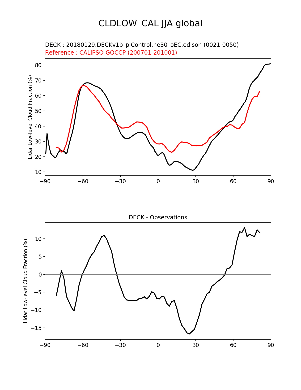 Use this command to recreate this image: | e3sm_diags --no_viewer --sets 'zonal_mean_xy' --case_id 'Cloud Calipso' --variables 'CLDLOW_CAL' --ref_name 'CALIPSOCOSP' --reference_name 'CALIPSO-GOCCP' --seasons 'JJA' --run_type 'model_vs_obs' --regions 'global' --regrid_tool 'esmf' --regrid_method 'conservative' --main_title 'CLDLOW_CAL JJA global' --backend 'mpl' --save_netcdf --output_format 'png' --output_format_subplot 'pdf' --canvas_size_w '1212' --canvas_size_h '1628' --figsize '8.5' '11.0' --dpi '150' --arrows --test_name '20180129.DECKv1b_piControl.ne30_oEC.edison' --test_title 'DECK' --test_colormap 'cet_rainbow.rgb' --reference_colormap 'cet_rainbow.rgb' --diff_title 'DECK - Observations' --diff_colormap 'diverging_bwr.rgb' --multiprocessing --num_workers '16' --granulate 'variables' 'seasons' 'regions' 'plevs' --selectors 'sets' 'seasons' --reference_data_path '/global/project/projectdirs/acme/acme_diags/obs_for_e3sm_diags/climatology/' --results_dir '/global/cscratch1/sd/golaz/E3SM/paper_HR/e3sm_diags/v1-LR/' --test_data_path '/global/cscratch1/sd/acmedata/E3SM_simulations/20180129.DECKv1b_piControl.ne30_oEC.edison/atm/mon_180x360/' |