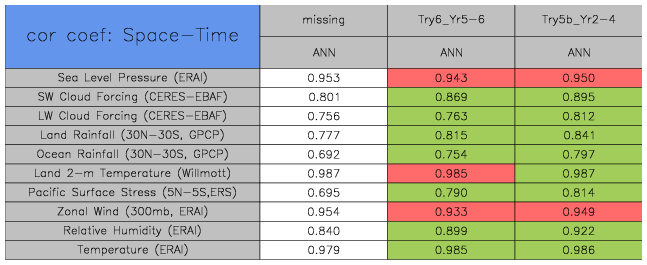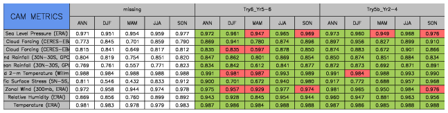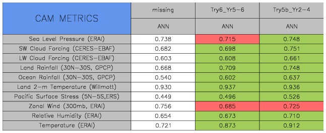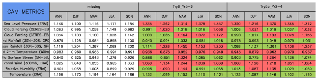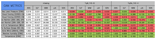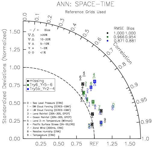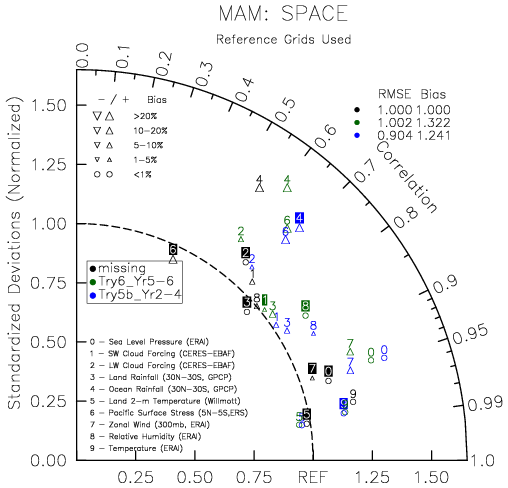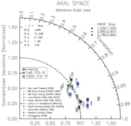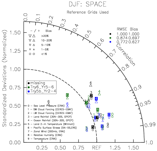 Taylor Diagrams were developed by Karl Taylor at PCMDI (paper|tech note) and aim to condense information about variance and RMSE characteristics of a particular model run when compared with observations in a single diagram. The tables summarize the individual metrics for each variable considered including: