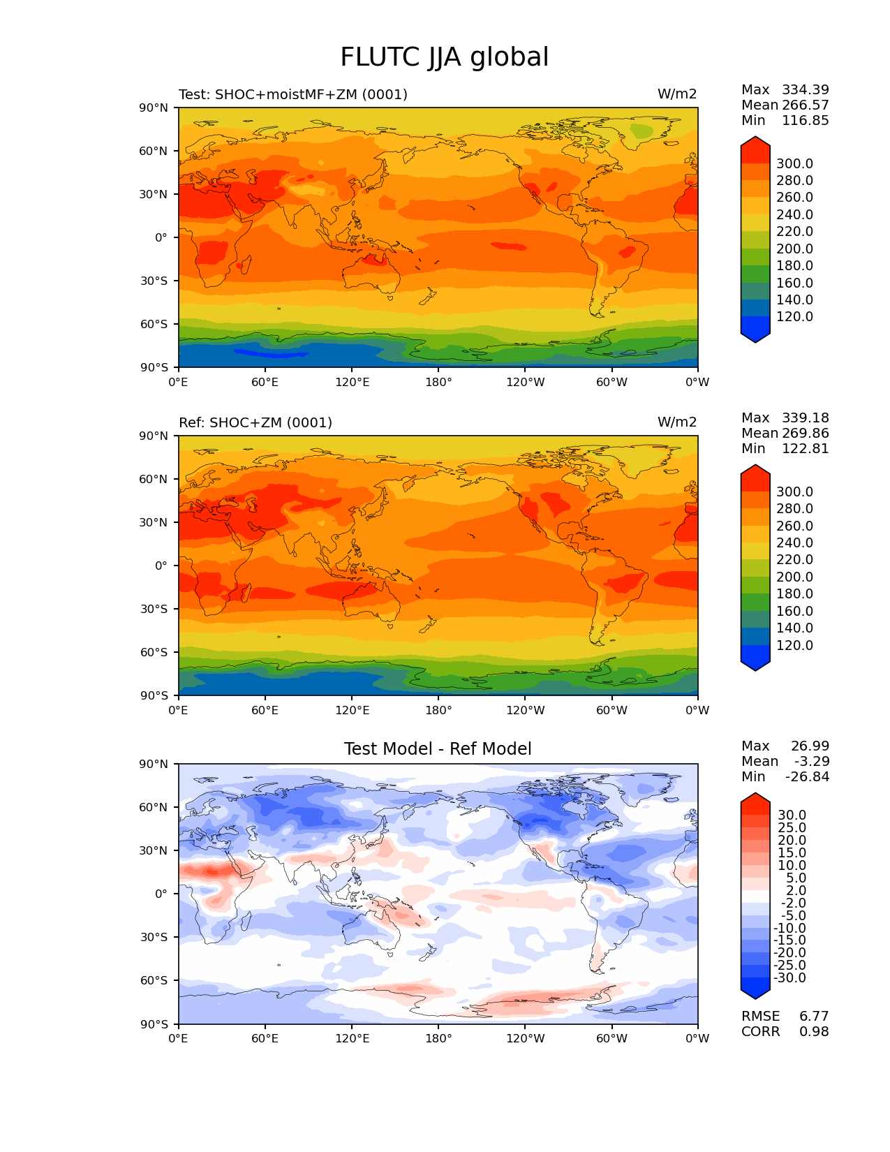 Use this command to recreate this image: | e3sm_diags lat_lon --no_viewer --case_id 'model_vs_model' --sets 'lat_lon' --run_type 'model_vs_model' --variables 'FLUTC' --seasons 'JJA' --regions 'global' --regrid_tool 'esmf' --regrid_method 'conservative' --main_title 'FLUTC JJA global' --backend 'mpl' --output_format 'png' --canvas_size_w '1212' --canvas_size_h '1628' --figsize '8.5' '11.0' --dpi '150' --arrows --contour_levels '120' '140' '160' '180' '200' '220' '240' '260' '280' '300' --test_name 'scream_mkw.SHOCMF_moist.001.ne30_ne30.cori-knl' --short_test_name 'Test: SHOC+moistMF+ZM' --test_colormap 'cet_rainbow.rgb' --ref_name 'scream_mkw.SHOC.001.ne30_ne30.cori-knl' --reference_colormap 'cet_rainbow.rgb' --diff_title 'Test Model - Ref Model' --diff_colormap 'diverging_bwr.rgb' --diff_levels '-30' '-25' '-20' '-15' '-10' '-5' '-2' '2' '5' '10' '15' '20' '25' '30' --num_workers '4' --granulate 'variables' 'seasons' 'plevs' 'regions' --selectors 'sets' 'seasons' --reference_data_path '/global/cscratch1/sd/mkwitte/shocmf_climo_fv129x256/' --test_data_path '/global/cscratch1/sd/mkwitte/shocmf_climo_fv129x256/' --results_dir '/global/cfs/cdirs/e3sm/www/mkwitte/shocmf_test1/yr1' |