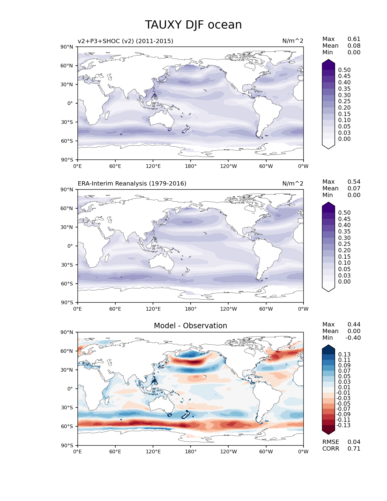 Use this command to recreate this image: | e3sm_diags lat_lon --no_viewer --case_id 'ERA-Interim' --sets 'lat_lon' --run_type 'model_vs_obs' --variables 'TAUXY' --seasons 'DJF' --regions 'ocean' --regrid_tool 'esmf' --regrid_method 'conservative' --main_title 'TAUXY DJF ocean' --backend 'mpl' --output_format 'png' --canvas_size_w '1212' --canvas_size_h '1628' --figsize '8.5' '11.0' --dpi '150' --arrows --contour_levels '0.0' '0.025' '0.05' '0.1' '0.15' '0.2' '0.25' '0.3' '0.35' '0.4' '0.45' '0.5' --test_name 'E3SM_v2SHOC.Phase1_experiment_v2.F2010SC5-SHOC.ne30pg2_r05_oECv3' --short_test_name 'v2+P3+SHOC (v2)' --test_colormap 'Purples' --ref_name 'ERA-Interim' --reference_name 'ERA-Interim Reanalysis' --reference_colormap 'Purples' --diff_title 'Model - Observation' --diff_colormap 'RdBu' --diff_levels '-0.13' '-0.11' '-0.09' '-0.07' '-0.05' '-0.03' '-0.01' '0.01' '0.03' '0.05' '0.07' '0.09' '0.11' '0.13' --multiprocessing --num_workers '32' --granulate 'variables' 'seasons' 'plevs' 'regions' --selectors 'sets' 'seasons' --reference_data_path '/global/cfs/cdirs/e3sm/acme_diags/obs_for_e3sm_diags/climatology/' --test_data_path '/global/cscratch1/sd/terai/E3SM_NGD-ATMPhys/E3SM_v2_SHOC/ne30_v2/climo_rgr/' --results_dir '/global/cfs/cdirs/e3sm/www/terai/E3SMv2_P3SHOCv2vsobs_2021May10_comp/main' |