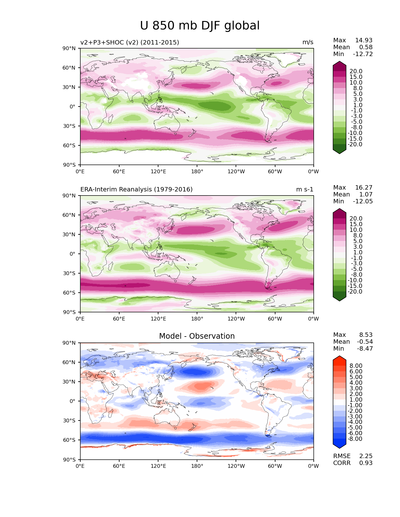 Use this command to recreate this image: | e3sm_diags lat_lon --no_viewer --case_id 'ERA-Interim' --sets 'lat_lon' --run_type 'model_vs_obs' --variables 'U' --seasons 'DJF' --regions 'global' --regrid_tool 'esmf' --regrid_method 'conservative' --plevs '850.0' --main_title 'U 850 mb DJF global' --backend 'mpl' --output_format 'png' --canvas_size_w '1212' --canvas_size_h '1628' --figsize '8.5' '11.0' --dpi '150' --arrows --contour_levels '-20' '-15' '-10' '-8' '-5' '-3' '-1' '1' '3' '5' '8' '10' '15' '20' --test_name 'E3SM_v2SHOC.Phase1_experiment_v2.F2010SC5-SHOC.ne30pg2_r05_oECv3' --short_test_name 'v2+P3+SHOC (v2)' --test_colormap 'PiYG_r' --ref_name 'ERA-Interim' --reference_name 'ERA-Interim Reanalysis' --reference_colormap 'PiYG_r' --diff_title 'Model - Observation' --diff_colormap 'diverging_bwr.rgb' --diff_levels '-8' '-6' '-5' '-4' '-3' '-2' '-1' '1' '2' '3' '4' '5' '6' '8' --multiprocessing --num_workers '32' --granulate 'variables' 'seasons' 'plevs' 'regions' --selectors 'sets' 'seasons' --reference_data_path '/global/cfs/cdirs/e3sm/acme_diags/obs_for_e3sm_diags/climatology/' --test_data_path '/global/cscratch1/sd/terai/E3SM_NGD-ATMPhys/E3SM_v2_SHOC/ne30_v2/climo_rgr/' --results_dir '/global/cfs/cdirs/e3sm/www/terai/E3SMv2_P3SHOCv2vsobs_2021May10_comp/main' |
