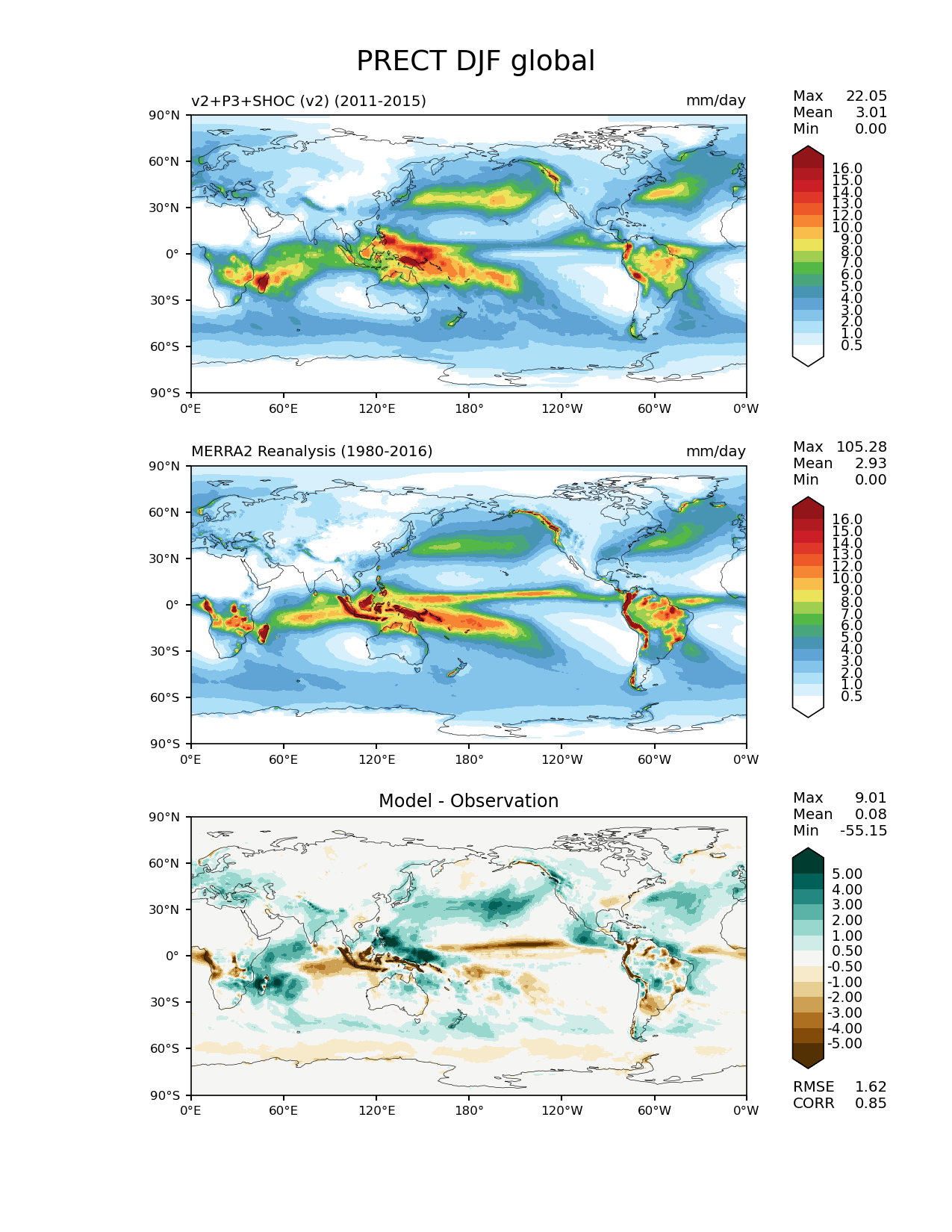 Use this command to recreate this image: | e3sm_diags lat_lon --no_viewer --case_id 'MERRA2' --sets 'lat_lon' --run_type 'model_vs_obs' --variables 'PRECT' --seasons 'DJF' --regions 'global' --regrid_tool 'esmf' --regrid_method 'conservative' --main_title 'PRECT DJF global' --backend 'mpl' --output_format 'png' --canvas_size_w '1212' --canvas_size_h '1628' --figsize '8.5' '11.0' --dpi '150' --arrows --contour_levels '0.5' '1' '2' '3' '4' '5' '6' '7' '8' '9' '10' '12' '13' '14' '15' '16' --test_name 'E3SM_v2SHOC.Phase1_experiment_v2.F2010SC5-SHOC.ne30pg2_r05_oECv3' --short_test_name 'v2+P3+SHOC (v2)' --test_colormap 'WhiteBlueGreenYellowRed.rgb' --ref_name 'MERRA2' --reference_name 'MERRA2 Reanalysis' --reference_colormap 'WhiteBlueGreenYellowRed.rgb' --diff_title 'Model - Observation' --diff_colormap 'BrBG' --diff_levels '-5' '-4' '-3' '-2' '-1' '-0.5' '0.5' '1' '2' '3' '4' '5' --multiprocessing --num_workers '32' --granulate 'variables' 'seasons' 'plevs' 'regions' --selectors 'sets' 'seasons' --reference_data_path '/global/cfs/cdirs/e3sm/acme_diags/obs_for_e3sm_diags/climatology/' --test_data_path '/global/cscratch1/sd/terai/E3SM_NGD-ATMPhys/E3SM_v2_SHOC/ne30_v2/climo_rgr/' --results_dir '/global/cfs/cdirs/e3sm/www/terai/E3SMv2_P3SHOCv2vsobs_2021May10_comp/main' |