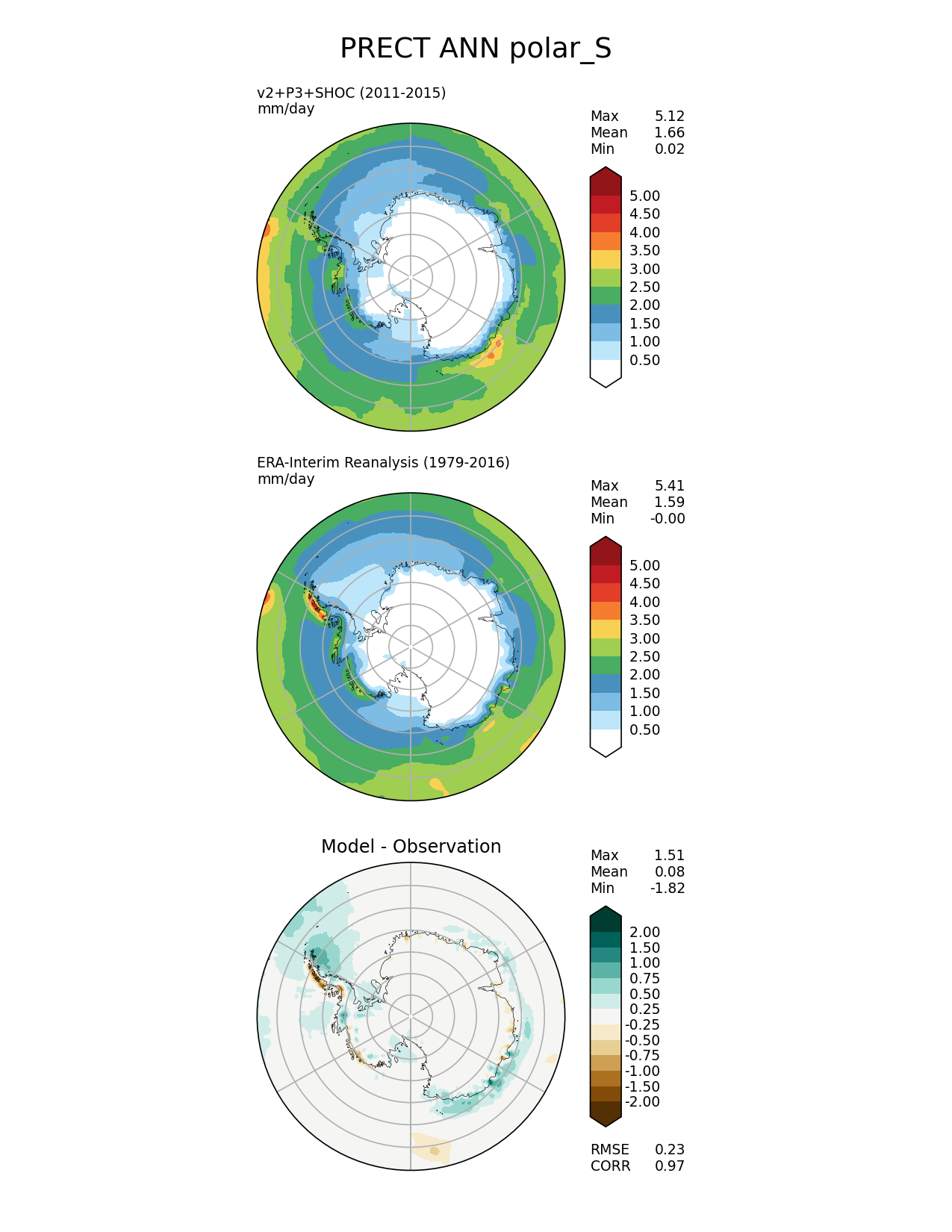 Use this command to recreate this image: | e3sm_diags polar --no_viewer --case_id 'ERA-Interim' --sets 'polar' --run_type 'model_vs_obs' --variables 'PRECT' --seasons 'ANN' --regions 'polar_S' --regrid_tool 'esmf' --regrid_method 'conservative' --main_title 'PRECT ANN polar_S' --backend 'mpl' --output_format 'png' --canvas_size_w '1212' --canvas_size_h '1628' --figsize '8.5' '11.0' --dpi '150' --arrows --contour_levels '0.5' '1' '1.5' '2' '2.5' '3' '3.5' '4' '4.5' '5' --test_name 'E3SM_v2SHOC.Phase1_experiment.F2010SC5-SHOC.ne30pg2_r05_oECv3' --short_test_name 'v2+P3+SHOC' --test_colormap 'WhiteBlueGreenYellowRed.rgb' --ref_name 'ERA-Interim' --reference_name 'ERA-Interim Reanalysis' --reference_colormap 'WhiteBlueGreenYellowRed.rgb' --diff_title 'Model - Observation' --diff_colormap 'BrBG' --diff_levels '-2' '-1.5' '-1' '-0.75' '-0.5' '-0.25' '0.25' '0.5' '0.75' '1' '1.5' '2' --multiprocessing --num_workers '32' --granulate 'variables' 'seasons' 'plevs' 'regions' --selectors 'sets' 'seasons' --reference_data_path '/global/cfs/cdirs/e3sm/acme_diags/obs_for_e3sm_diags/climatology/' --test_data_path '/global/cscratch1/sd/terai/E3SM_NGD-ATMPhys/E3SM_v2_SHOC/ne30/climo_rgr/' --results_dir '/global/cfs/cdirs/e3sm/www/terai/E3SMv2_P3SHOCvsobs_2021May6_comp/main' |