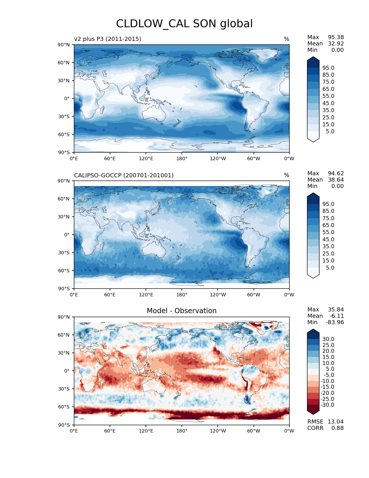 Use this command to recreate this image: | e3sm_diags lat_lon --no_viewer --case_id 'Cloud Calipso' --sets 'lat_lon' --run_type 'model_vs_obs' --variables 'CLDLOW_CAL' --seasons 'SON' --regions 'global' --regrid_tool 'esmf' --regrid_method 'conservative' --main_title 'CLDLOW_CAL SON global' --backend 'mpl' --output_format 'png' --canvas_size_w '1212' --canvas_size_h '1628' --figsize '8.5' '11.0' --dpi '150' --arrows --contour_levels '5' '15' '25' '35' '45' '55' '65' '75' '85' '95' --test_name 'E3SM_alpha5_59_v2candidate.F2010SC5-CMIP6_wP3_v2.ne30pg2_r05_oECv3.compy' --short_test_name 'v2 plus P3' --test_colormap 'Blues' --ref_name 'CALIPSOCOSP' --reference_name 'CALIPSO-GOCCP' --reference_colormap 'Blues' --diff_title 'Model - Observation' --diff_colormap 'RdBu' --diff_levels '-30' '-25' '-20' '-15' '-10' '-5' '5' '10' '15' '20' '25' '30' --multiprocessing --num_workers '32' --granulate 'variables' 'seasons' 'plevs' 'regions' --selectors 'sets' 'seasons' --reference_data_path '/global/cfs/cdirs/e3sm/acme_diags/obs_for_e3sm_diags/climatology/' --test_data_path '/global/cfs/cdirs/e3sm/shpundk/E3SMv2_alpha5_59/wP3_v2/eam-h0/eam-rgr/' --results_dir '/global/cfs/cdirs/e3sm/www/terai/E3SMv2_P3vsMG2_v2/obs' |