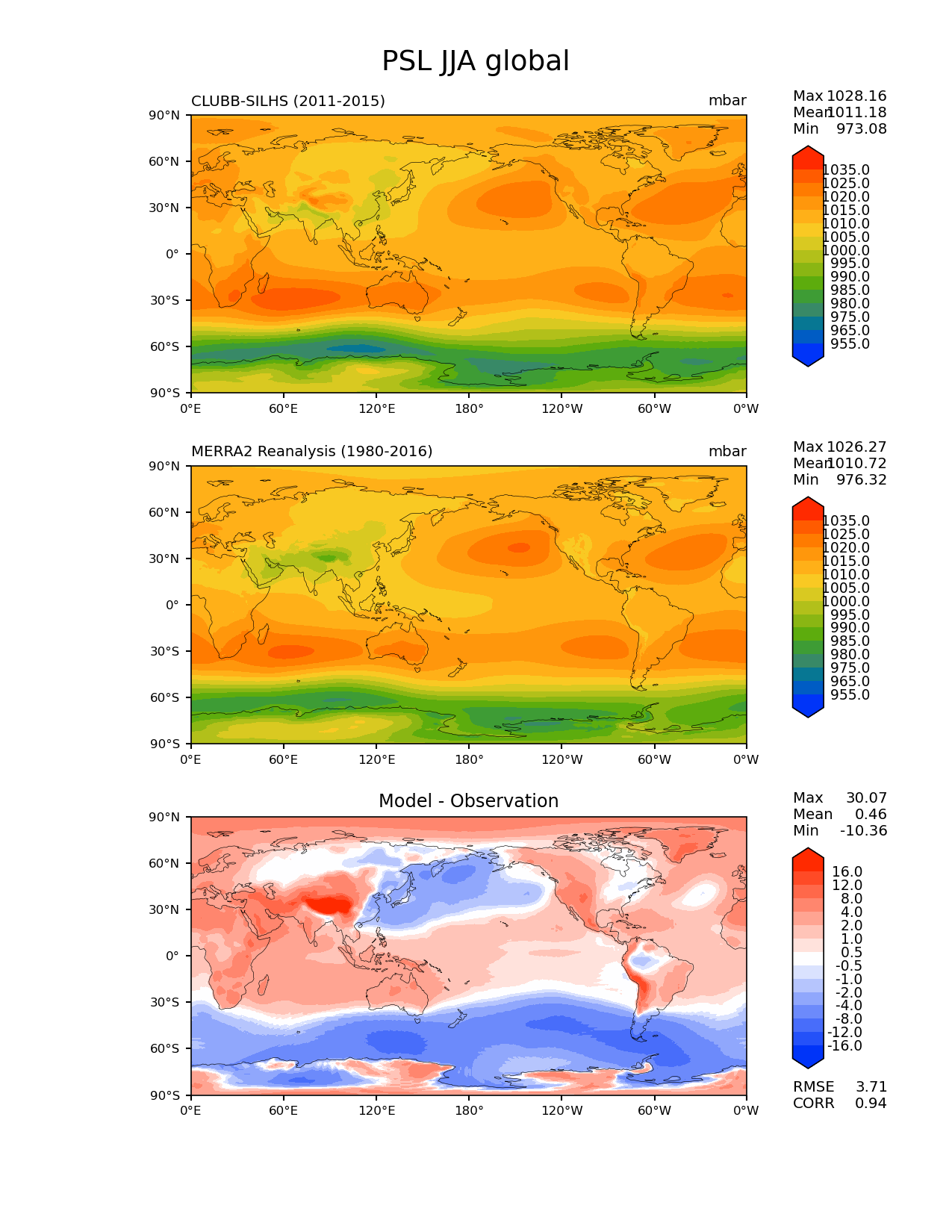 Use this command to recreate this image: | e3sm_diags lat_lon --no_viewer --case_id 'MERRA2' --sets 'lat_lon' --run_type 'model_vs_obs' --variables 'PSL' --seasons 'JJA' --regions 'global' --regrid_tool 'esmf' --regrid_method 'conservative' --main_title 'PSL JJA global' --backend 'mpl' --output_format 'png' --canvas_size_w '1212' --canvas_size_h '1628' --figsize '8.5' '11.0' --dpi '150' --arrows --contour_levels '955' '965' '975' '980' '985' '990' '995' '1000' '1005' '1010' '1015' '1020' '1025' '1035' --test_name 'anvil.default.NGD_clubb_silhs_P3_std_fallspeed.ne30_ne30' --short_test_name 'CLUBB-SILHS' --test_colormap 'cet_rainbow.rgb' --ref_name 'MERRA2' --reference_name 'MERRA2 Reanalysis' --reference_colormap 'cet_rainbow.rgb' --diff_title 'Model - Observation' --diff_colormap 'diverging_bwr.rgb' --diff_levels '-16' '-12' '-8' '-4' '-2' '-1' '-0.5' '0.5' '1' '2' '4' '8' '12' '16' --multiprocessing --num_workers '32' --granulate 'variables' 'seasons' 'plevs' 'regions' --selectors 'sets' 'seasons' --reference_data_path '/global/cfs/cdirs/e3sm/acme_diags/obs_for_e3sm_diags/climatology/' --test_data_path '/global/cscratch1/sd/terai/E3SM_NGD-ATMPhys/Convection_diagnostic/CLUBB-SILHS/Phase1/ne30/climo_rgr/' --results_dir '/global/cfs/cdirs/e3sm/www/terai/v3_ConvAssessment/CLUBB-SILHS/Phase1/obs' |