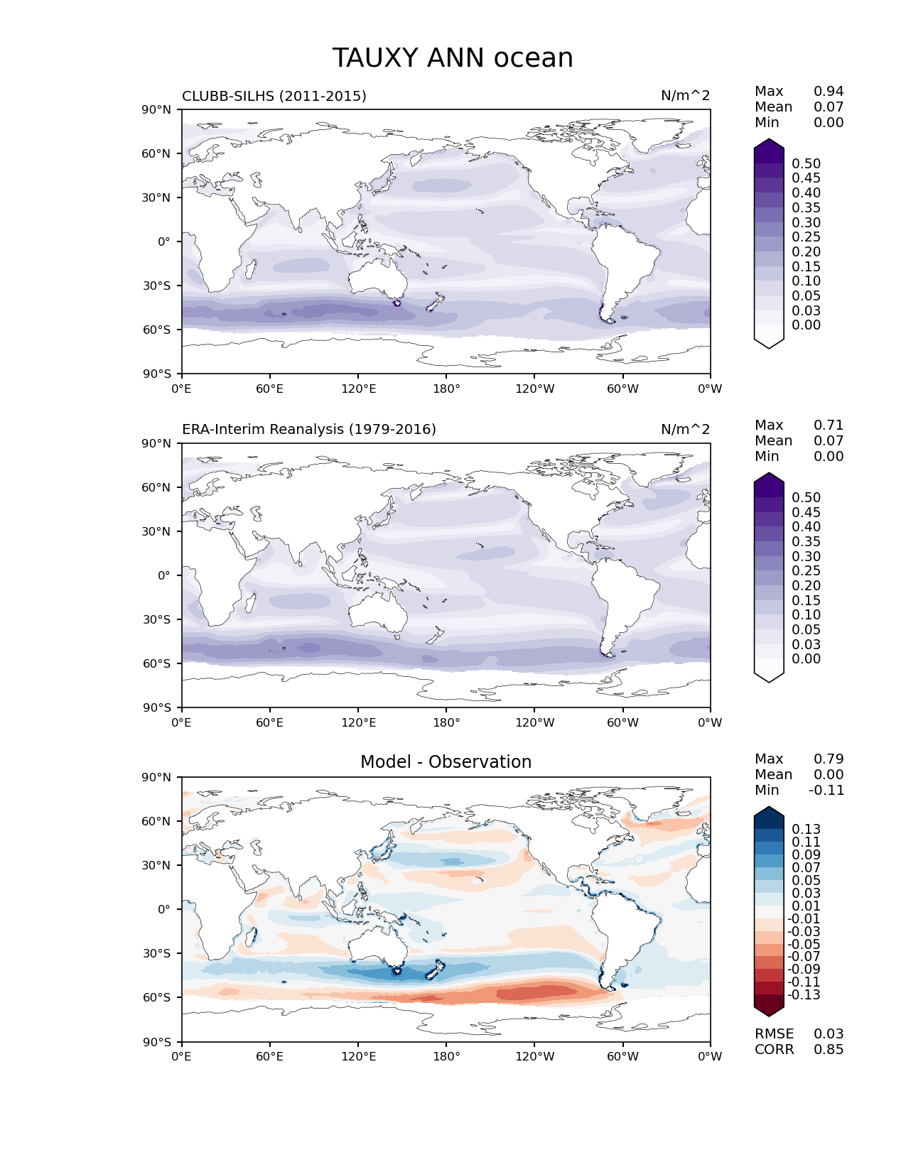 Use this command to recreate this image: | e3sm_diags lat_lon --no_viewer --case_id 'ERA-Interim' --sets 'lat_lon' --run_type 'model_vs_obs' --variables 'TAUXY' --seasons 'ANN' --regions 'ocean' --regrid_tool 'esmf' --regrid_method 'conservative' --main_title 'TAUXY ANN ocean' --backend 'mpl' --output_format 'png' --canvas_size_w '1212' --canvas_size_h '1628' --figsize '8.5' '11.0' --dpi '150' --arrows --contour_levels '0.0' '0.025' '0.05' '0.1' '0.15' '0.2' '0.25' '0.3' '0.35' '0.4' '0.45' '0.5' --test_name 'anvil.default.NGD_P3_config_prod_test_script.ne30_ne30' --short_test_name 'CLUBB-SILHS' --test_colormap 'Purples' --ref_name 'ERA-Interim' --reference_name 'ERA-Interim Reanalysis' --reference_colormap 'Purples' --diff_title 'Model - Observation' --diff_colormap 'RdBu' --diff_levels '-0.13' '-0.11' '-0.09' '-0.07' '-0.05' '-0.03' '-0.01' '0.01' '0.03' '0.05' '0.07' '0.09' '0.11' '0.13' --multiprocessing --num_workers '32' --granulate 'variables' 'seasons' 'plevs' 'regions' --selectors 'sets' 'seasons' --reference_data_path '/global/cfs/cdirs/e3sm/acme_diags/obs_for_e3sm_diags/climatology/' --test_data_path '/global/cscratch1/sd/terai/E3SM_NGD-ATMPhys/Convection_diagnostic/CLUBB-SILHS/Phase1/ne30/climo_rgr/' --results_dir '/global/cfs/cdirs/e3sm/www/terai/v3_ConvAssessment/CLUBB-SILHS/obs' |