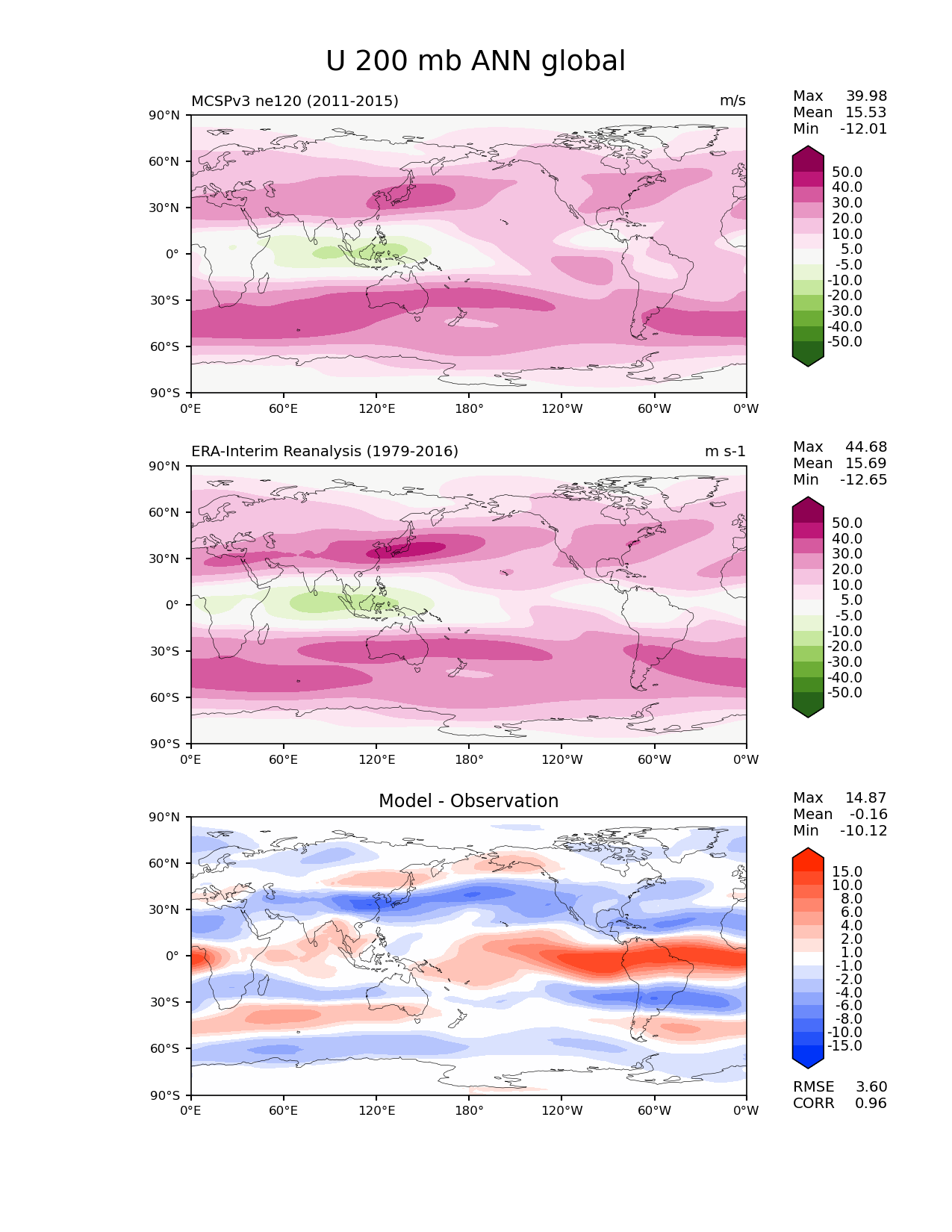 Use this command to recreate this image: | e3sm_diags lat_lon --no_viewer --case_id 'ERA-Interim' --sets 'lat_lon' --run_type 'model_vs_obs' --variables 'U' --seasons 'ANN' --regions 'global' --regrid_tool 'esmf' --regrid_method 'conservative' --plevs '200.0' --main_title 'U 200 mb ANN global' --backend 'mpl' --output_format 'png' --canvas_size_w '1212' --canvas_size_h '1628' --figsize '8.5' '11.0' --dpi '150' --arrows --contour_levels '-50' '-40' '-30' '-20' '-10' '-5' '5' '10' '20' '30' '40' '50' --test_name 'E3SM_alpha5_59_v2candidate_NGD_Conv.MCSPv3.ne120pg2_r0125_oRRS18to6v3.comp' --short_test_name 'MCSPv3 ne120' --test_colormap 'PiYG_r' --ref_name 'ERA-Interim' --reference_name 'ERA-Interim Reanalysis' --reference_colormap 'PiYG_r' --diff_title 'Model - Observation' --diff_colormap 'diverging_bwr.rgb' --diff_levels '-15' '-10' '-8' '-6' '-4' '-2' '-1' '1' '2' '4' '6' '8' '10' '15' --multiprocessing --num_workers '32' --granulate 'variables' 'seasons' 'plevs' 'regions' --selectors 'sets' 'seasons' --reference_data_path '/global/cfs/cdirs/e3sm/acme_diags/obs_for_e3sm_diags/climatology/' --test_data_path '/global/cscratch1/sd/terai/E3SM_NGD-ATMPhys/Convection_diagnostic/MCSPv3/ne120/climo_rgr/' --results_dir '/global/cfs/cdirs/e3sm/www/terai/v3_ConvAssessment/MCSPv3/ne120obs' |