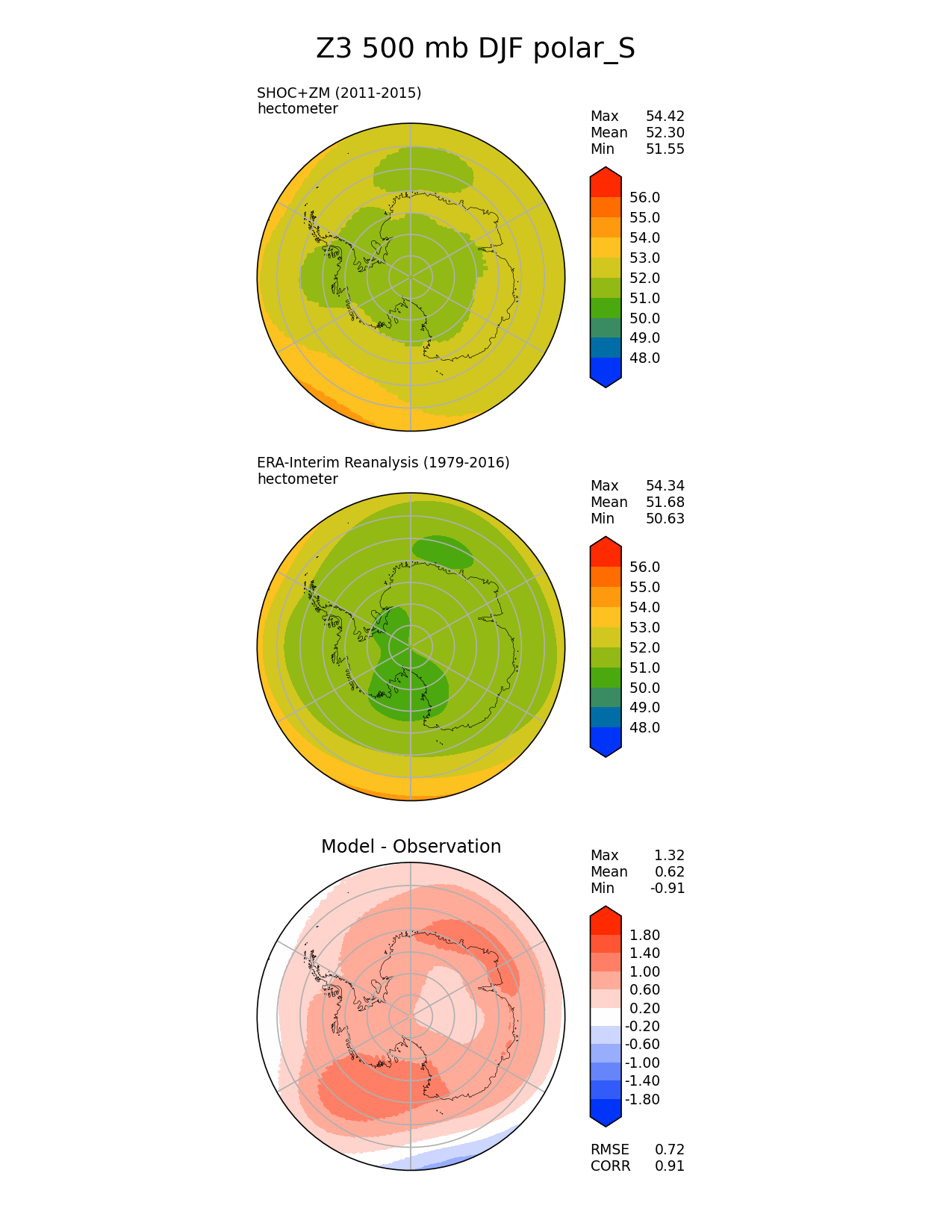 Use this command to recreate this image: | e3sm_diags polar --no_viewer --case_id 'ERA-Interim' --sets 'polar' --run_type 'model_vs_obs' --variables 'Z3' --seasons 'DJF' --regions 'polar_S' --regrid_tool 'esmf' --regrid_method 'conservative' --plevs '500.0' --main_title 'Z3 500 mb DJF polar_S' --backend 'mpl' --output_format 'png' --canvas_size_w '1212' --canvas_size_h '1628' --figsize '8.5' '11.0' --dpi '150' --arrows --contour_levels '48' '49' '50' '51' '52' '53' '54' '55' '56' --test_name 'E3SM_v2SHOC.Phase1_experiment.F2010SC5-SHOC.ne30pg2_r05_oECv3' --short_test_name 'SHOC+ZM' --test_colormap 'cet_rainbow.rgb' --ref_name 'ERA-Interim' --reference_name 'ERA-Interim Reanalysis' --reference_colormap 'cet_rainbow.rgb' --diff_title 'Model - Observation' --diff_colormap 'diverging_bwr.rgb' --diff_levels '-1.8' '-1.4' '-1.0' '-0.6' '-0.2' '0.2' '0.6' '1.0' '1.4' '1.8' --multiprocessing --num_workers '32' --granulate 'variables' 'seasons' 'plevs' 'regions' --selectors 'sets' 'seasons' --reference_data_path '/global/cfs/cdirs/e3sm/acme_diags/obs_for_e3sm_diags/climatology/' --test_data_path '/global/cscratch1/sd/terai/E3SM_NGD-ATMPhys/Convection_diagnostic/SHOC_ZM/ne30/climo_rgr/' --results_dir '/global/cfs/cdirs/e3sm/www/terai/v3_ConvAssessment/SHOC_ZM/obs' |