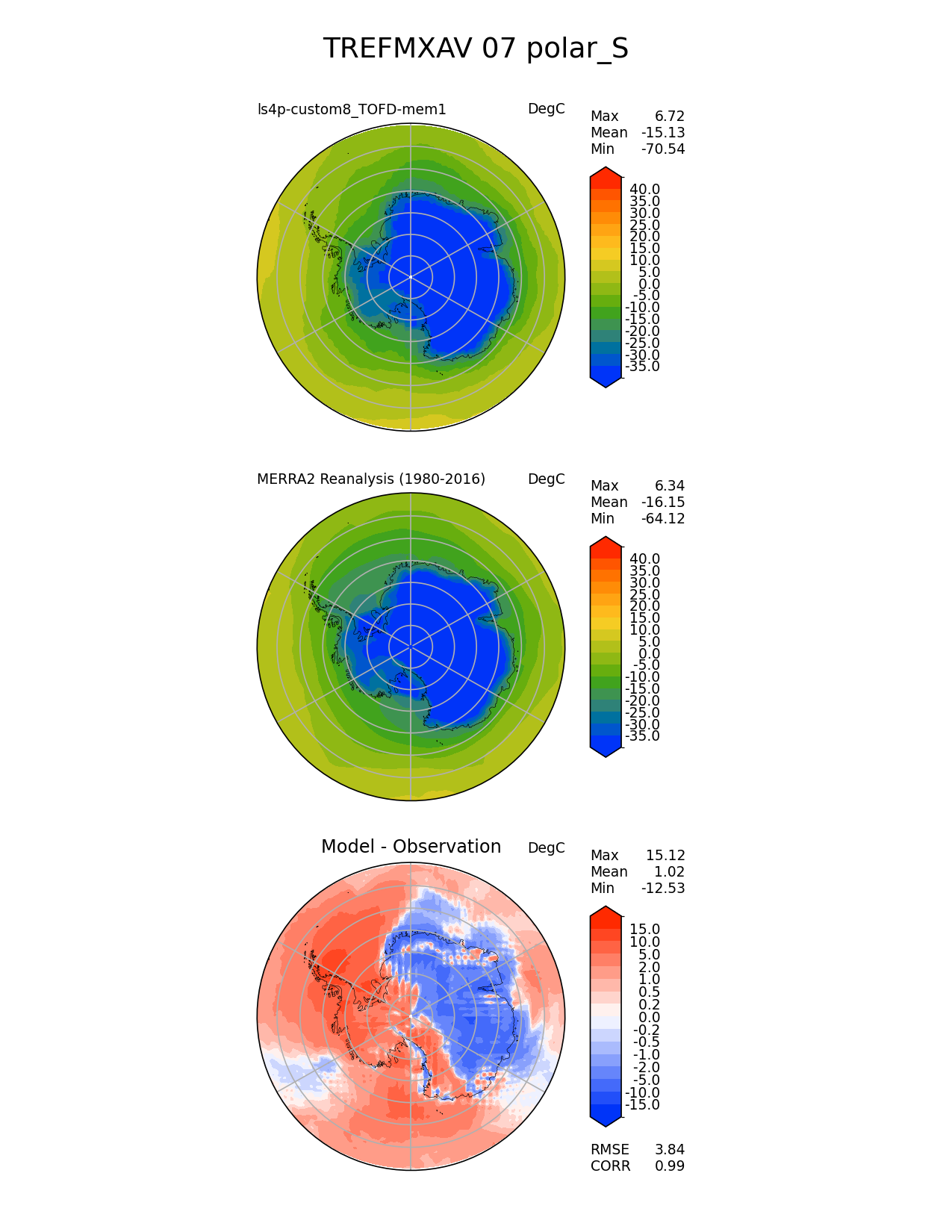 Use this command to recreate this image: | e3sm_diags polar --no_viewer --reference_data_path '/global/cfs/cdirs/e3sm/diagnostics/observations/Atm/climatology' --test_data_path '/pscratch/sd/x/xie7/ls4p/zppy/output/ls4p-custom8_TOFD-mem/ls4p-custom8_TOFD-mem1/ncremap' --results_dir '/global/cfs/cdirs/e3sm/www/xie7/diags_ls4p/ls4p_TOFD_1' --case_id 'MERRA2' --run_type 'model_vs_obs' --sets 'polar' --variables 'TREFMXAV' --seasons 07 --regions 'polar_S' --regrid_tool 'esmf' --regrid_method 'conservative' --num_workers '4' --main_title 'TREFMXAV 07 polar_S' --backend 'mpl' --output_format 'png' --canvas_size_w '1212' --canvas_size_h '1628' --figsize '8.5' '11.0' --dpi '150' --arrows --contour_levels '-35' '-30' '-25' '-20' '-15' '-10' '-5' '0' '5' '10' '15' '20' '25' '30' '35' '40' --test_name 'ls4p-custom8_TOFD-mem1' --test_colormap 'cet_rainbow.rgb' --ref_name 'MERRA2' --reference_name 'MERRA2 Reanalysis' --reference_colormap 'cet_rainbow.rgb' --diff_title 'Model - Observation' --diff_colormap 'diverging_bwr.rgb' --diff_levels '-15' '-10' '-5' '-2' '-1' '-0.5' '-0.2' '0' '0.2' '0.5' '1' '2' '5' '10' '15' --granulate 'variables' 'seasons' 'plevs' 'regions' --selectors 'sets' 'seasons' |