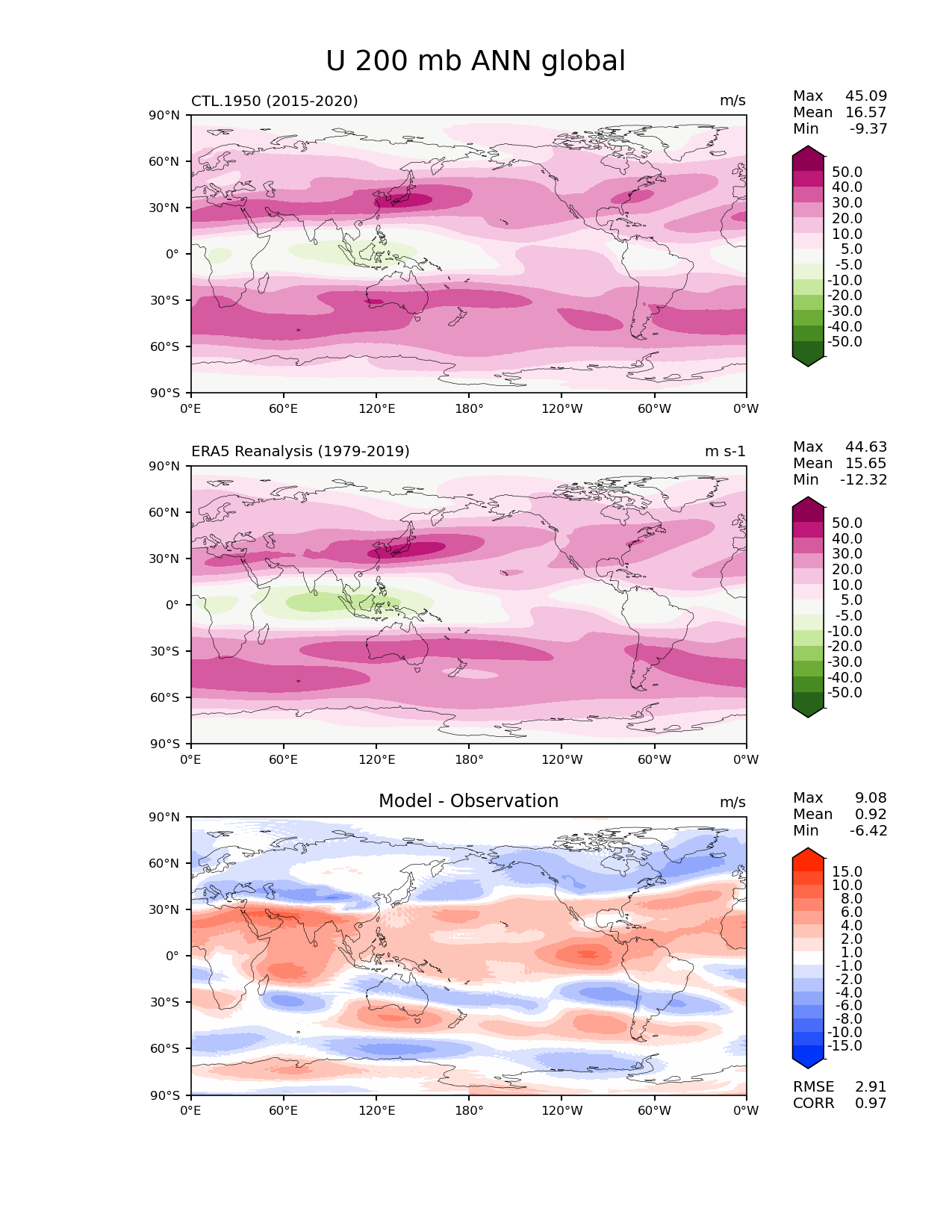 Use this command to recreate this image: | e3sm_diags lat_lon --no_viewer --case_id 'ERA5' --sets 'lat_lon' --run_type 'model_vs_obs' --variables 'U' --seasons 'ANN' --regions 'global' --regrid_tool 'esmf' --regrid_method 'conservative' --plevs '200.0' --main_title 'U 200 mb ANN global' --backend 'mpl' --output_format 'png' --canvas_size_w '1212' --canvas_size_h '1628' --figsize '8.5' '11.0' --dpi '150' --arrows --contour_levels '-50' '-40' '-30' '-20' '-10' '-5' '5' '10' '20' '30' '40' '50' --test_name 'CTL.1950' --test_title ' ' --test_colormap 'PiYG_r' --ref_name 'ERA5' --reference_name 'ERA5 Reanalysis' --reference_colormap 'PiYG_r' --diff_title 'Model - Observation' --diff_colormap 'diverging_bwr.rgb' --diff_levels '-15' '-10' '-8' '-6' '-4' '-2' '-1' '1' '2' '4' '6' '8' '10' '15' --num_workers '4' --granulate 'variables' 'seasons' 'plevs' 'regions' --selectors 'sets' 'seasons' --reference_data_path '/global/cfs/cdirs/e3sm/acme_diags/obs_for_e3sm_diags/climatology/' --test_data_path '/global/cscratch1/sd/xsongsio/E3SM_simulations/CTL.1950/diag/clim_rgr/6yr/' --results_dir '/global/cfs/cdirs/e3sm/www/xsongsio/CTL.1950/6yr' |