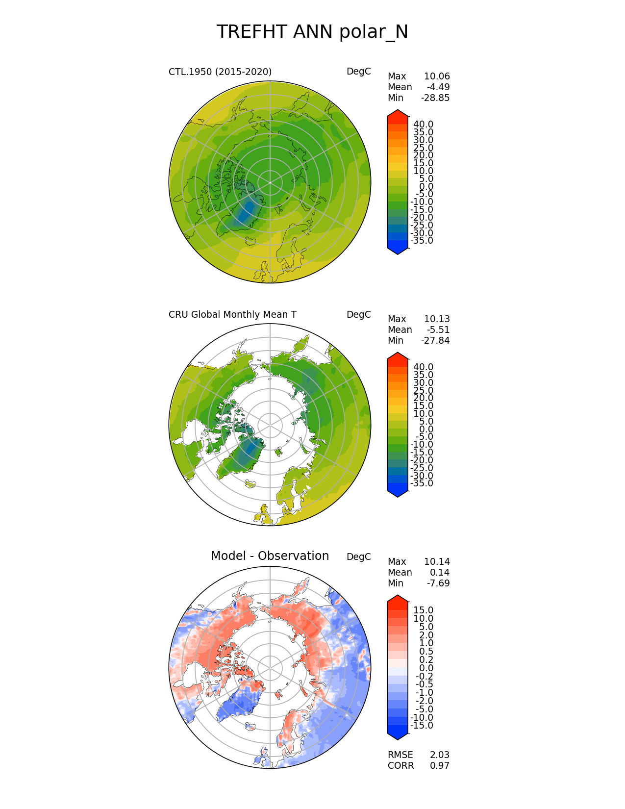 Use this command to recreate this image: | e3sm_diags polar --no_viewer --case_id 'CRU_IPCC' --sets 'polar' --run_type 'model_vs_obs' --variables 'TREFHT' --seasons 'ANN' --regions 'polar_N' --regrid_tool 'esmf' --regrid_method 'conservative' --main_title 'TREFHT ANN polar_N' --backend 'mpl' --output_format 'png' --canvas_size_w '1212' --canvas_size_h '1628' --figsize '8.5' '11.0' --dpi '150' --arrows --contour_levels '-35' '-30' '-25' '-20' '-15' '-10' '-5' '0' '5' '10' '15' '20' '25' '30' '35' '40' --test_name 'CTL.1950' --test_title ' ' --test_colormap 'cet_rainbow.rgb' --ref_name 'CRU' --reference_name 'CRU Global Monthly Mean T' --reference_colormap 'cet_rainbow.rgb' --diff_title 'Model - Observation' --diff_colormap 'diverging_bwr.rgb' --diff_levels '-15' '-10' '-5' '-2' '-1' '-0.5' '-0.2' '0' '0.2' '0.5' '1' '2' '5' '10' '15' --num_workers '4' --granulate 'variables' 'seasons' 'plevs' 'regions' --selectors 'sets' 'seasons' --reference_data_path '/global/cfs/cdirs/e3sm/acme_diags/obs_for_e3sm_diags/climatology/' --test_data_path '/global/cscratch1/sd/xsongsio/E3SM_simulations/CTL.1950/diag/clim_rgr/6yr/' --results_dir '/global/cfs/cdirs/e3sm/www/xsongsio/CTL.1950/6yr' |