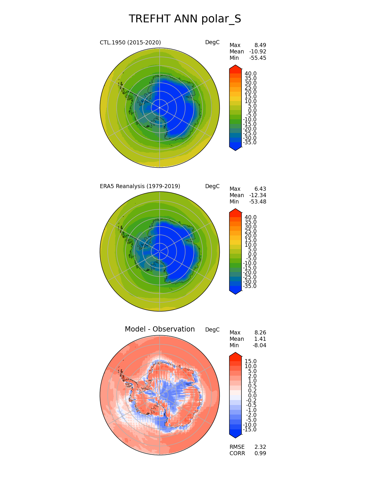 Use this command to recreate this image: | e3sm_diags polar --no_viewer --case_id 'ERA5' --sets 'polar' --run_type 'model_vs_obs' --variables 'TREFHT' --seasons 'ANN' --regions 'polar_S' --regrid_tool 'esmf' --regrid_method 'conservative' --main_title 'TREFHT ANN polar_S' --backend 'mpl' --output_format 'png' --canvas_size_w '1212' --canvas_size_h '1628' --figsize '8.5' '11.0' --dpi '150' --arrows --contour_levels '-35' '-30' '-25' '-20' '-15' '-10' '-5' '0' '5' '10' '15' '20' '25' '30' '35' '40' --test_name 'CTL.1950' --test_title ' ' --test_colormap 'cet_rainbow.rgb' --ref_name 'ERA5' --reference_name 'ERA5 Reanalysis' --reference_colormap 'cet_rainbow.rgb' --diff_title 'Model - Observation' --diff_colormap 'diverging_bwr.rgb' --diff_levels '-15' '-10' '-5' '-2' '-1' '-0.5' '-0.2' '0' '0.2' '0.5' '1' '2' '5' '10' '15' --num_workers '4' --granulate 'variables' 'seasons' 'plevs' 'regions' --selectors 'sets' 'seasons' --reference_data_path '/global/cfs/cdirs/e3sm/acme_diags/obs_for_e3sm_diags/climatology/' --test_data_path '/global/cscratch1/sd/xsongsio/E3SM_simulations/CTL.1950/diag/clim_rgr/6yr/' --results_dir '/global/cfs/cdirs/e3sm/www/xsongsio/CTL.1950/6yr' |