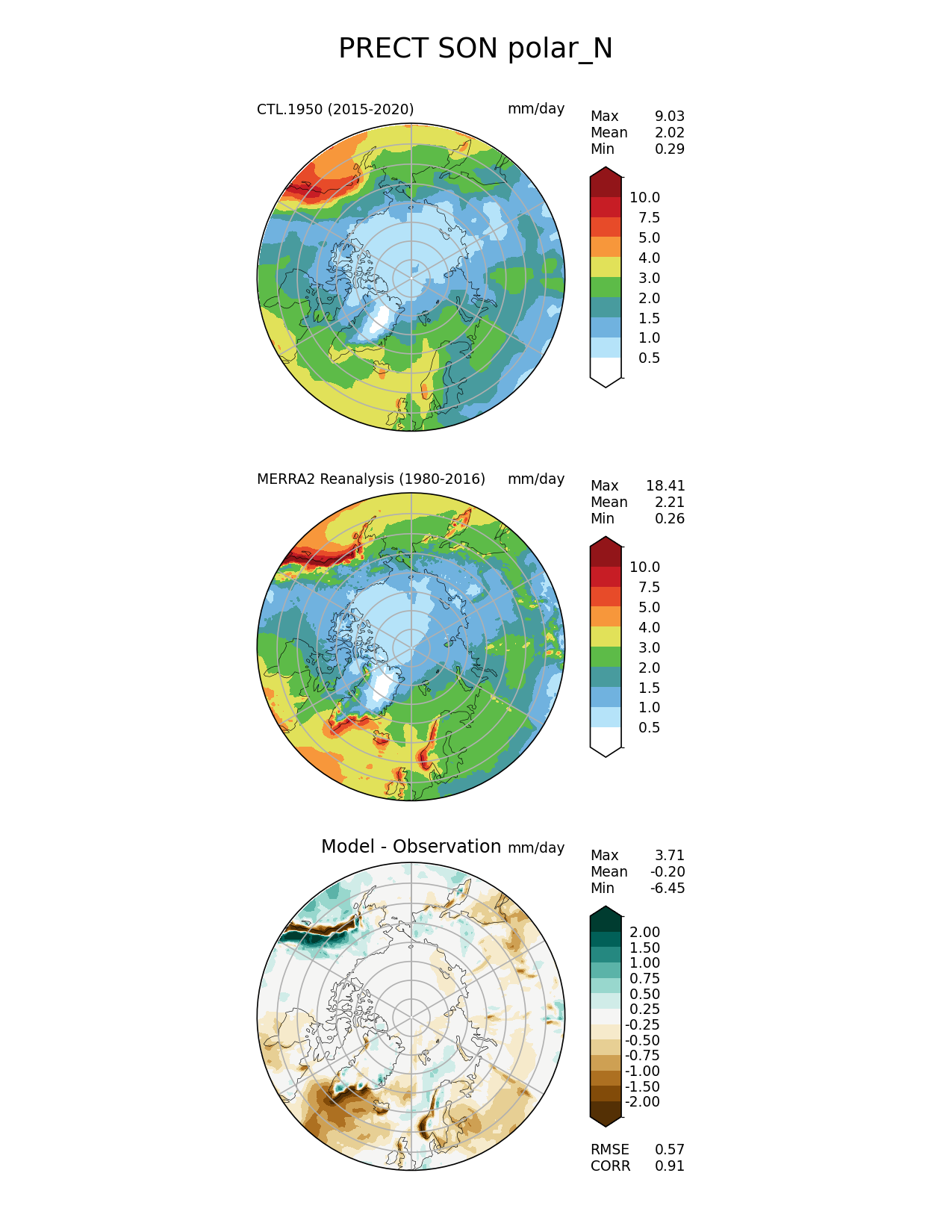 Use this command to recreate this image: | e3sm_diags polar --no_viewer --case_id 'MERRA2' --sets 'polar' --run_type 'model_vs_obs' --variables 'PRECT' --seasons 'SON' --regions 'polar_N' --regrid_tool 'esmf' --regrid_method 'conservative' --main_title 'PRECT SON polar_N' --backend 'mpl' --output_format 'png' --canvas_size_w '1212' --canvas_size_h '1628' --figsize '8.5' '11.0' --dpi '150' --arrows --contour_levels '0.5' '1' '1.5' '2' '3' '4' '5' '7.5' '10' --test_name 'CTL.1950' --test_title ' ' --test_colormap 'WhiteBlueGreenYellowRed.rgb' --ref_name 'MERRA2' --reference_name 'MERRA2 Reanalysis' --reference_colormap 'WhiteBlueGreenYellowRed.rgb' --diff_title 'Model - Observation' --diff_colormap 'BrBG' --diff_levels '-2' '-1.5' '-1' '-0.75' '-0.5' '-0.25' '0.25' '0.5' '0.75' '1' '1.5' '2' --num_workers '4' --granulate 'variables' 'seasons' 'plevs' 'regions' --selectors 'sets' 'seasons' --reference_data_path '/global/cfs/cdirs/e3sm/acme_diags/obs_for_e3sm_diags/climatology/' --test_data_path '/global/cscratch1/sd/xsongsio/E3SM_simulations/CTL.1950/diag/clim_rgr/6yr/' --results_dir '/global/cfs/cdirs/e3sm/www/xsongsio/CTL.1950/6yr' |