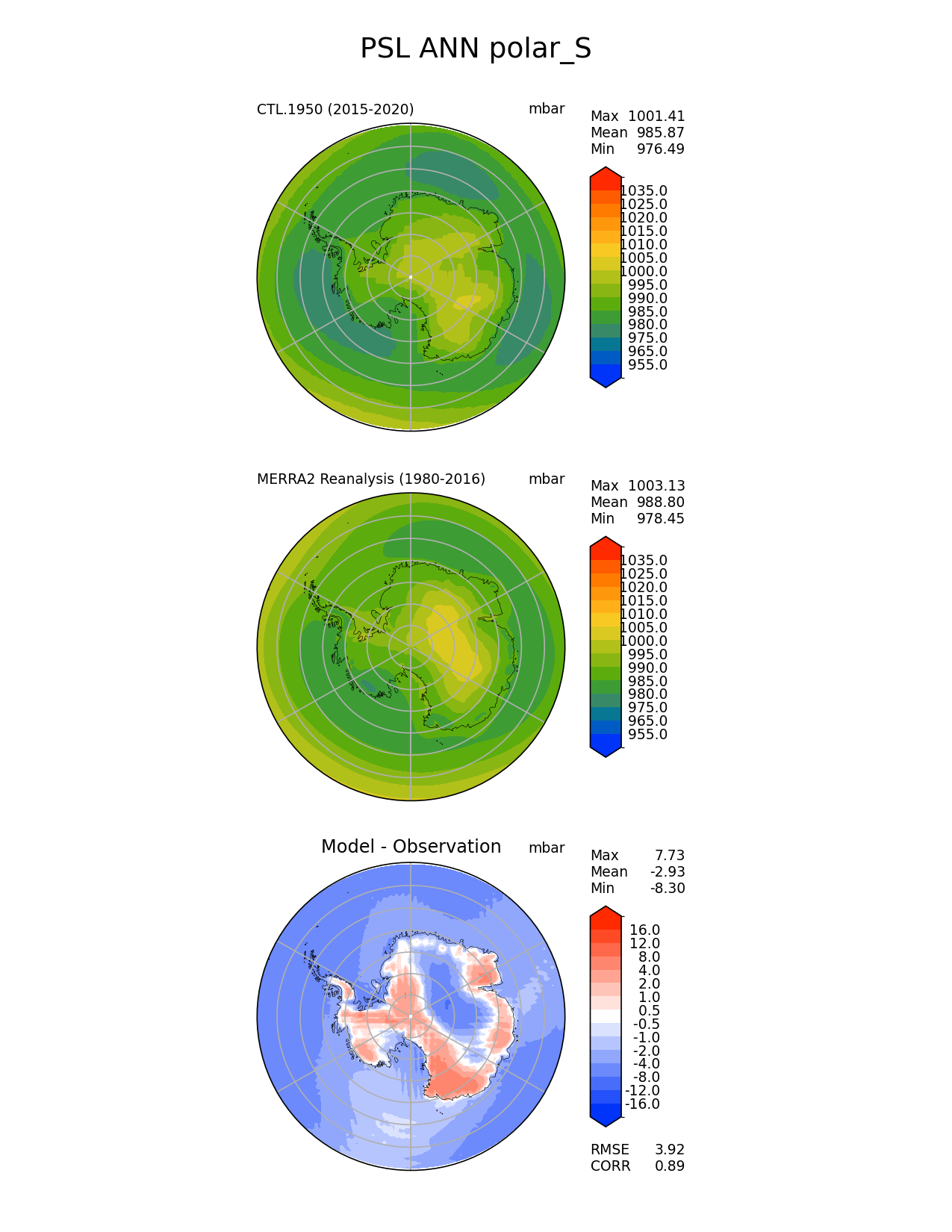 Use this command to recreate this image: | e3sm_diags polar --no_viewer --case_id 'MERRA2' --sets 'polar' --run_type 'model_vs_obs' --variables 'PSL' --seasons 'ANN' --regions 'polar_S' --regrid_tool 'esmf' --regrid_method 'conservative' --main_title 'PSL ANN polar_S' --backend 'mpl' --output_format 'png' --canvas_size_w '1212' --canvas_size_h '1628' --figsize '8.5' '11.0' --dpi '150' --arrows --contour_levels '955' '965' '975' '980' '985' '990' '995' '1000' '1005' '1010' '1015' '1020' '1025' '1035' --test_name 'CTL.1950' --test_title ' ' --test_colormap 'cet_rainbow.rgb' --ref_name 'MERRA2' --reference_name 'MERRA2 Reanalysis' --reference_colormap 'cet_rainbow.rgb' --diff_title 'Model - Observation' --diff_colormap 'diverging_bwr.rgb' --diff_levels '-16' '-12' '-8' '-4' '-2' '-1' '-0.5' '0.5' '1' '2' '4' '8' '12' '16' --num_workers '4' --granulate 'variables' 'seasons' 'plevs' 'regions' --selectors 'sets' 'seasons' --reference_data_path '/global/cfs/cdirs/e3sm/acme_diags/obs_for_e3sm_diags/climatology/' --test_data_path '/global/cscratch1/sd/xsongsio/E3SM_simulations/CTL.1950/diag/clim_rgr/6yr/' --results_dir '/global/cfs/cdirs/e3sm/www/xsongsio/CTL.1950/6yr' |