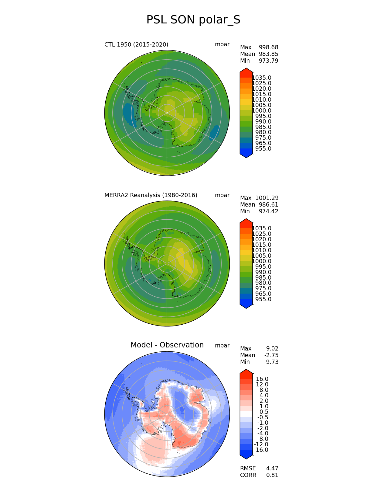 Use this command to recreate this image: | e3sm_diags polar --no_viewer --case_id 'MERRA2' --sets 'polar' --run_type 'model_vs_obs' --variables 'PSL' --seasons 'SON' --regions 'polar_S' --regrid_tool 'esmf' --regrid_method 'conservative' --main_title 'PSL SON polar_S' --backend 'mpl' --output_format 'png' --canvas_size_w '1212' --canvas_size_h '1628' --figsize '8.5' '11.0' --dpi '150' --arrows --contour_levels '955' '965' '975' '980' '985' '990' '995' '1000' '1005' '1010' '1015' '1020' '1025' '1035' --test_name 'CTL.1950' --test_title ' ' --test_colormap 'cet_rainbow.rgb' --ref_name 'MERRA2' --reference_name 'MERRA2 Reanalysis' --reference_colormap 'cet_rainbow.rgb' --diff_title 'Model - Observation' --diff_colormap 'diverging_bwr.rgb' --diff_levels '-16' '-12' '-8' '-4' '-2' '-1' '-0.5' '0.5' '1' '2' '4' '8' '12' '16' --num_workers '4' --granulate 'variables' 'seasons' 'plevs' 'regions' --selectors 'sets' 'seasons' --reference_data_path '/global/cfs/cdirs/e3sm/acme_diags/obs_for_e3sm_diags/climatology/' --test_data_path '/global/cscratch1/sd/xsongsio/E3SM_simulations/CTL.1950/diag/clim_rgr/6yr/' --results_dir '/global/cfs/cdirs/e3sm/www/xsongsio/CTL.1950/6yr' |