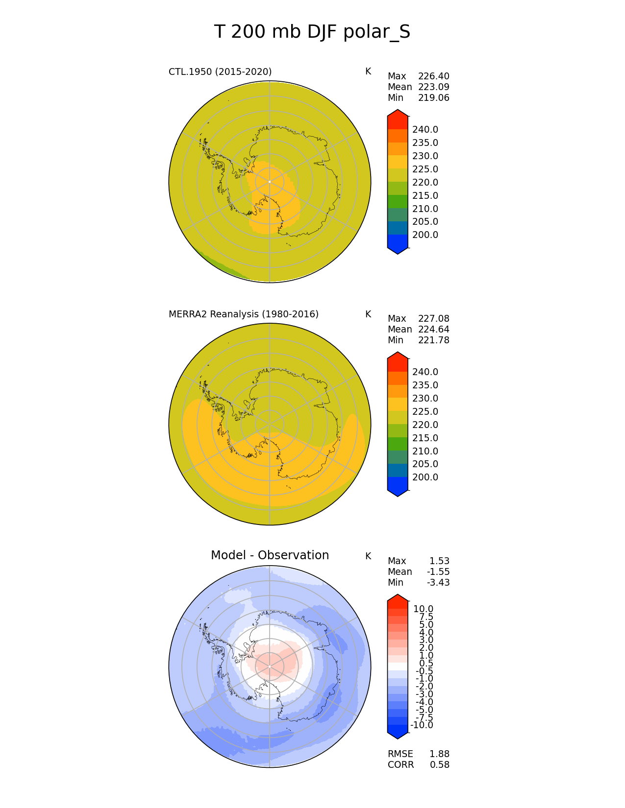 Use this command to recreate this image: | e3sm_diags polar --no_viewer --case_id 'MERRA2' --sets 'polar' --run_type 'model_vs_obs' --variables 'T' --seasons 'DJF' --regions 'polar_S' --regrid_tool 'esmf' --regrid_method 'conservative' --plevs '200.0' --main_title 'T 200 mb DJF polar_S' --backend 'mpl' --output_format 'png' --canvas_size_w '1212' --canvas_size_h '1628' --figsize '8.5' '11.0' --dpi '150' --arrows --contour_levels '200' '205' '210' '215' '220' '225' '230' '235' '240' --test_name 'CTL.1950' --test_title ' ' --test_colormap 'cet_rainbow.rgb' --ref_name 'MERRA2' --reference_name 'MERRA2 Reanalysis' --reference_colormap 'cet_rainbow.rgb' --diff_title 'Model - Observation' --diff_colormap 'diverging_bwr.rgb' --diff_levels '-10' '-7.5' '-5' '-4' '-3' '-2' '-1' '-0.5' '0.5' '1' '2' '3' '4' '5' '7.5' '10' --num_workers '4' --granulate 'variables' 'seasons' 'plevs' 'regions' --selectors 'sets' 'seasons' --reference_data_path '/global/cfs/cdirs/e3sm/acme_diags/obs_for_e3sm_diags/climatology/' --test_data_path '/global/cscratch1/sd/xsongsio/E3SM_simulations/CTL.1950/diag/clim_rgr/6yr/' --results_dir '/global/cfs/cdirs/e3sm/www/xsongsio/CTL.1950/6yr' |