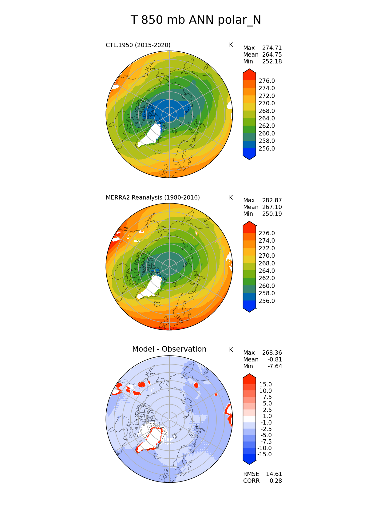 Use this command to recreate this image: | e3sm_diags polar --no_viewer --case_id 'MERRA2' --sets 'polar' --run_type 'model_vs_obs' --variables 'T' --seasons 'ANN' --regions 'polar_N' --regrid_tool 'esmf' --regrid_method 'conservative' --plevs '850.0' --main_title 'T 850 mb ANN polar_N' --backend 'mpl' --output_format 'png' --canvas_size_w '1212' --canvas_size_h '1628' --figsize '8.5' '11.0' --dpi '150' --arrows --contour_levels '256' '258' '260' '262' '264' '268' '270' '272' '274' '276' --test_name 'CTL.1950' --test_title ' ' --test_colormap 'cet_rainbow.rgb' --ref_name 'MERRA2' --reference_name 'MERRA2 Reanalysis' --reference_colormap 'cet_rainbow.rgb' --diff_title 'Model - Observation' --diff_colormap 'diverging_bwr.rgb' --diff_levels '-15' '-10' '-7.5' '-5' '-2.5' '-1' '1' '2.5' '5' '7.5' '10' '15' --num_workers '4' --granulate 'variables' 'seasons' 'plevs' 'regions' --selectors 'sets' 'seasons' --reference_data_path '/global/cfs/cdirs/e3sm/acme_diags/obs_for_e3sm_diags/climatology/' --test_data_path '/global/cscratch1/sd/xsongsio/E3SM_simulations/CTL.1950/diag/clim_rgr/6yr/' --results_dir '/global/cfs/cdirs/e3sm/www/xsongsio/CTL.1950/6yr' |