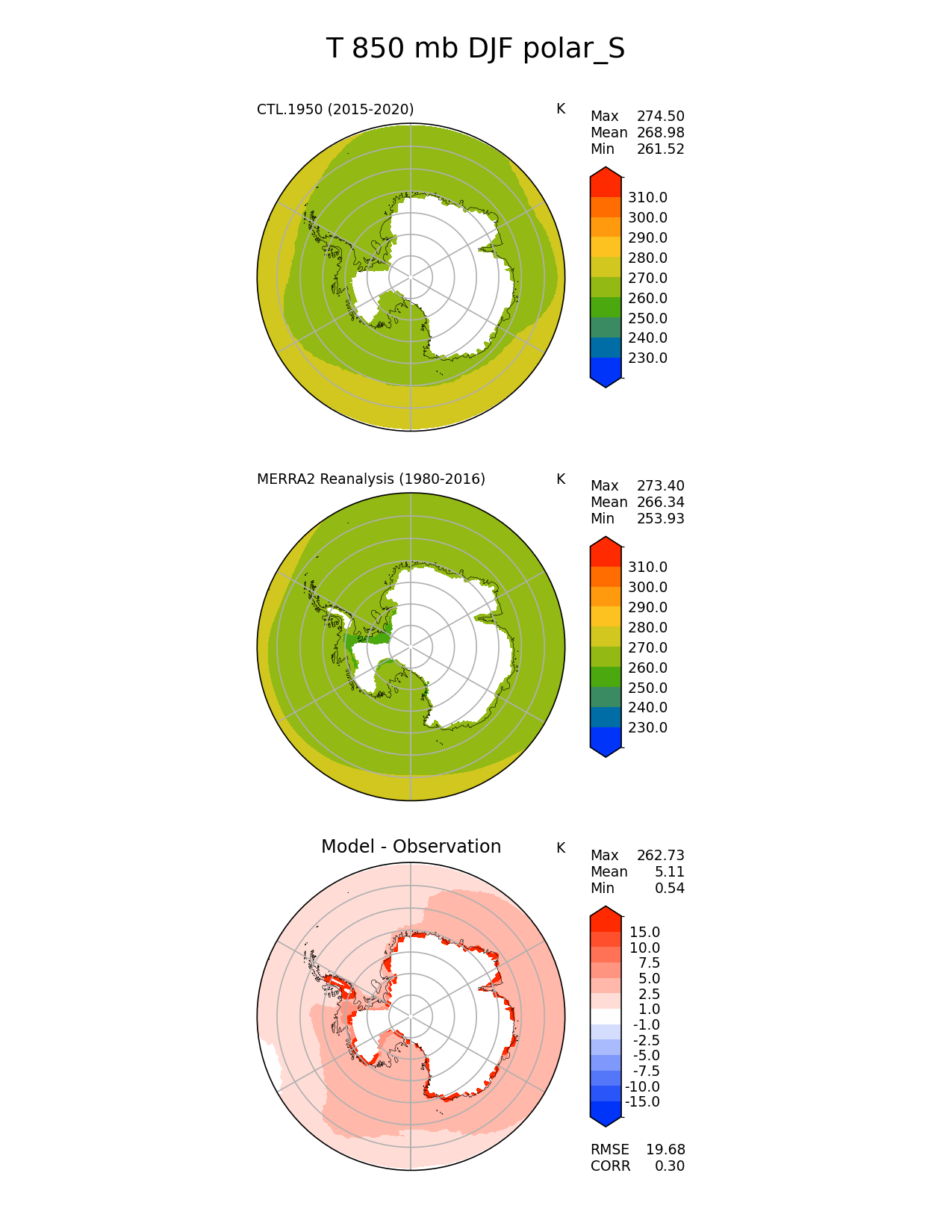 Use this command to recreate this image: | e3sm_diags polar --no_viewer --case_id 'MERRA2' --sets 'polar' --run_type 'model_vs_obs' --variables 'T' --seasons 'DJF' --regions 'polar_S' --regrid_tool 'esmf' --regrid_method 'conservative' --plevs '850.0' --main_title 'T 850 mb DJF polar_S' --backend 'mpl' --output_format 'png' --canvas_size_w '1212' --canvas_size_h '1628' --figsize '8.5' '11.0' --dpi '150' --arrows --contour_levels '230' '240' '250' '260' '270' '280' '290' '300' '310' --test_name 'CTL.1950' --test_title ' ' --test_colormap 'cet_rainbow.rgb' --ref_name 'MERRA2' --reference_name 'MERRA2 Reanalysis' --reference_colormap 'cet_rainbow.rgb' --diff_title 'Model - Observation' --diff_colormap 'diverging_bwr.rgb' --diff_levels '-15' '-10' '-7.5' '-5' '-2.5' '-1' '1' '2.5' '5' '7.5' '10' '15' --num_workers '4' --granulate 'variables' 'seasons' 'plevs' 'regions' --selectors 'sets' 'seasons' --reference_data_path '/global/cfs/cdirs/e3sm/acme_diags/obs_for_e3sm_diags/climatology/' --test_data_path '/global/cscratch1/sd/xsongsio/E3SM_simulations/CTL.1950/diag/clim_rgr/6yr/' --results_dir '/global/cfs/cdirs/e3sm/www/xsongsio/CTL.1950/6yr' |