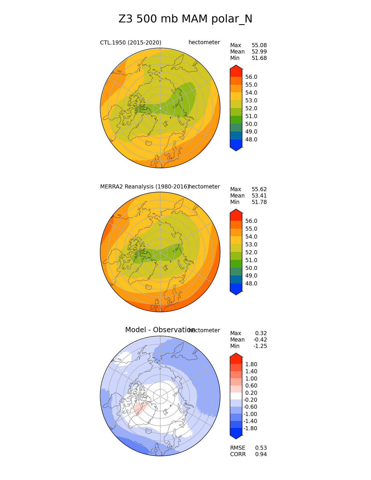 Use this command to recreate this image: | e3sm_diags polar --no_viewer --case_id 'MERRA2' --sets 'polar' --run_type 'model_vs_obs' --variables 'Z3' --seasons 'MAM' --regions 'polar_N' --regrid_tool 'esmf' --regrid_method 'conservative' --plevs '500.0' --main_title 'Z3 500 mb MAM polar_N' --backend 'mpl' --output_format 'png' --canvas_size_w '1212' --canvas_size_h '1628' --figsize '8.5' '11.0' --dpi '150' --arrows --contour_levels '48' '49' '50' '51' '52' '53' '54' '55' '56' --test_name 'CTL.1950' --test_title ' ' --test_colormap 'cet_rainbow.rgb' --ref_name 'MERRA2' --reference_name 'MERRA2 Reanalysis' --reference_colormap 'cet_rainbow.rgb' --diff_title 'Model - Observation' --diff_colormap 'diverging_bwr.rgb' --diff_levels '-1.8' '-1.4' '-1.0' '-0.6' '-0.2' '0.2' '0.6' '1.0' '1.4' '1.8' --num_workers '4' --granulate 'variables' 'seasons' 'plevs' 'regions' --selectors 'sets' 'seasons' --reference_data_path '/global/cfs/cdirs/e3sm/acme_diags/obs_for_e3sm_diags/climatology/' --test_data_path '/global/cscratch1/sd/xsongsio/E3SM_simulations/CTL.1950/diag/clim_rgr/6yr/' --results_dir '/global/cfs/cdirs/e3sm/www/xsongsio/CTL.1950/6yr' |