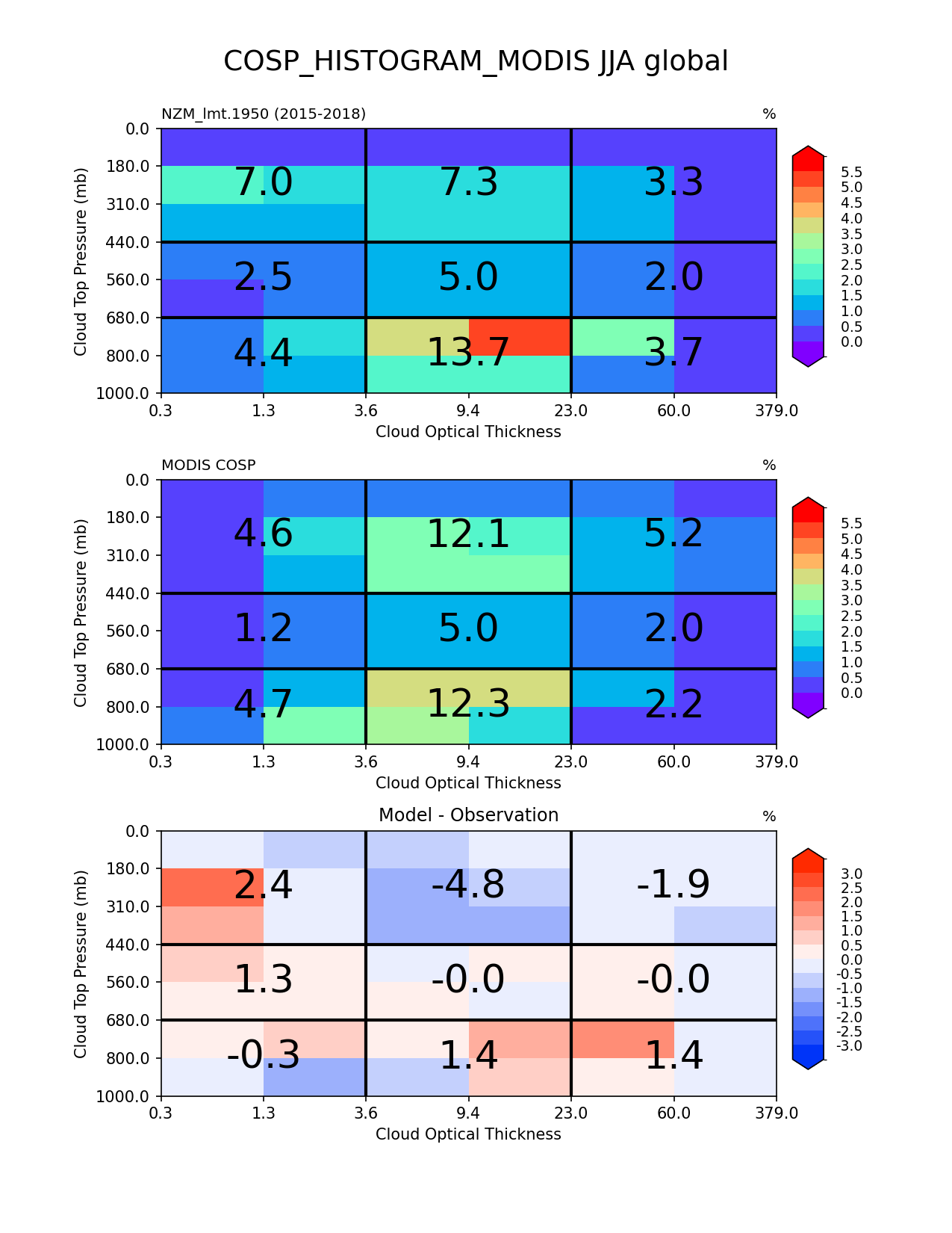 Use this command to recreate this image: | e3sm_diags cosp_histogram --no_viewer --case_id 'MODIS-COSP' --sets 'cosp_histogram' --run_type 'model_vs_obs' --variables 'COSP_HISTOGRAM_MODIS' --seasons 'JJA' --regions 'global' --regrid_tool 'esmf' --regrid_method 'conservative' --main_title 'COSP_HISTOGRAM_MODIS JJA global' --backend 'mpl' --output_format 'png' --canvas_size_w '1212' --canvas_size_h '1628' --figsize '8.5' '11.0' --dpi '150' --arrows --contour_levels '0' '0.5' '1.0' '1.5' '2.0' '2.5' '3.0' '3.5' '4.0' '4.5' '5.0' '5.5' --test_name 'NZM_lmt.1950' --test_title ' ' --test_colormap 'cet_rainbow.rgb' --ref_name 'MODISCOSP' --reference_name 'MODIS COSP' --reference_colormap 'cet_rainbow.rgb' --diff_title 'Model - Observation' --diff_colormap 'diverging_bwr.rgb' --diff_levels '-3.0' '-2.5' '-2.0' '-1.5' '-1.0' '-0.5' '0' '0.5' '1.0' '1.5' '2.0' '2.5' '3.0' --num_workers '4' --granulate 'variables' 'seasons' 'plevs' 'regions' --selectors 'sets' 'seasons' --reference_data_path '/global/cfs/cdirs/e3sm/acme_diags/obs_for_e3sm_diags/climatology/' --test_data_path '/global/cscratch1/sd/xsongsio/E3SM_simulations/NZM_lmt.1950/diag/clim_rgr/4yr/' --results_dir '/global/cfs/cdirs/e3sm/www/xsongsio/NZM_lmt.1950/4yr' |