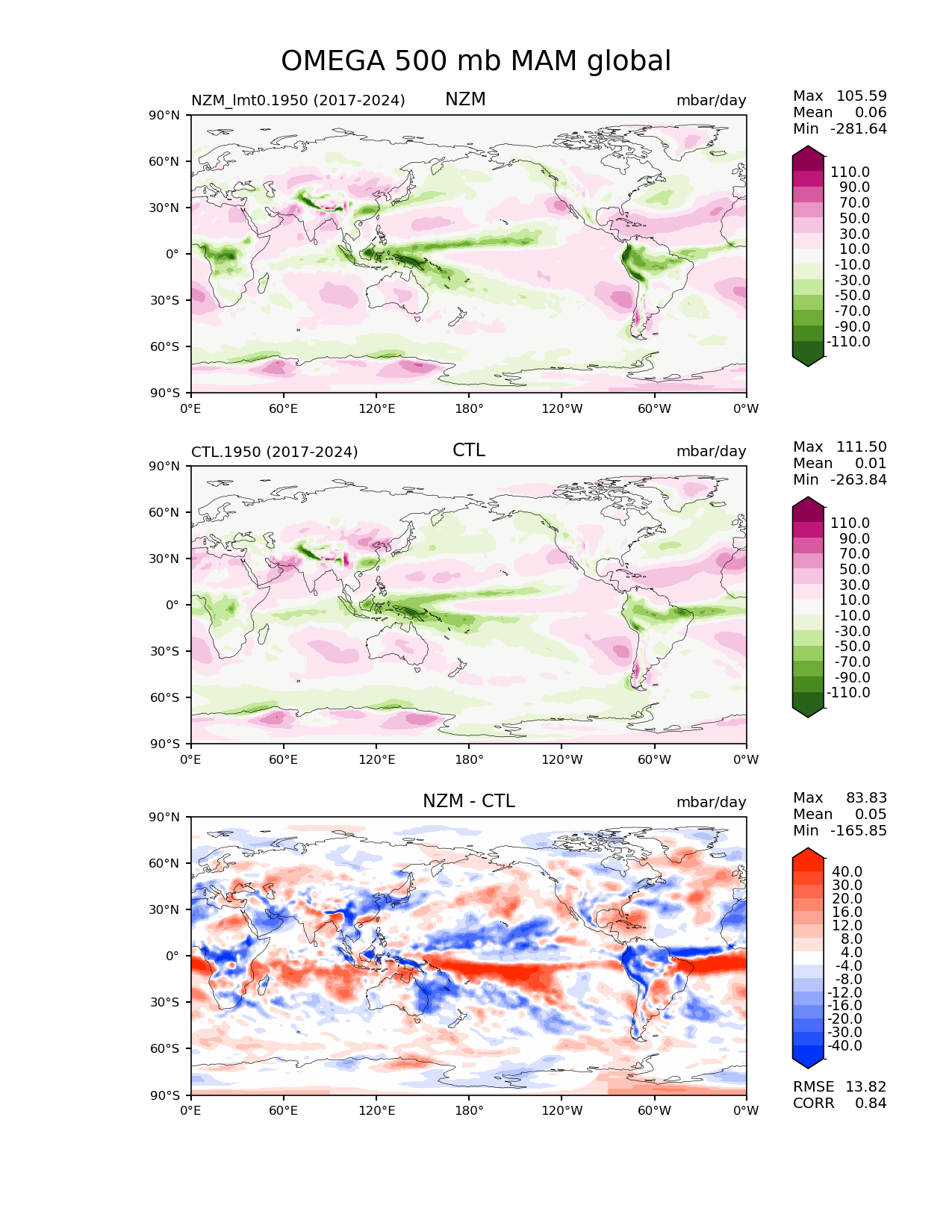 Use this command to recreate this image: | e3sm_diags lat_lon --no_viewer --reference_data_path '/pscratch/sd/x/xsongsio/DATA/CTL.1950/diag/clim_rgr/' --test_data_path '/pscratch/sd/x/xsongsio/DATA/NZM_lmt0.1950/diag/clim_rgr/' --results_dir '/global/cfs/cdirs/e3sm/www/xsongsio/NZM_lmt0.1950-CTL.1950/8yr' --case_id 'model_vs_model' --run_type 'model_vs_model' --sets 'lat_lon' --variables 'OMEGA' --seasons 'MAM' --regions 'global' --regrid_tool 'esmf' --regrid_method 'conservative' --plevs '500.0' --multiprocessing --num_workers '32' --main_title 'OMEGA 500 mb MAM global' --backend 'mpl' --output_format 'png' --canvas_size_w '1212' --canvas_size_h '1628' --figsize '8.5' '11.0' --dpi '150' --arrows --contour_levels '-110' '-90' '-70' '-50' '-30' '-10' '10' '30' '50' '70' '90' '110' --test_name 'NZM_lmt0.1950' --test_title 'NZM ' --test_colormap 'PiYG_r' --reference_name 'CTL.1950' --reference_title 'CTL' --reference_colormap 'PiYG_r' --diff_title 'NZM - CTL' --diff_colormap 'diverging_bwr.rgb' --diff_levels '-40' '-30' '-20' '-16' '-12' '-8' '-4' '4' '8' '12' '16' '20' '30' '40' --granulate 'variables' 'seasons' 'plevs' 'regions' --selectors 'sets' 'seasons' |