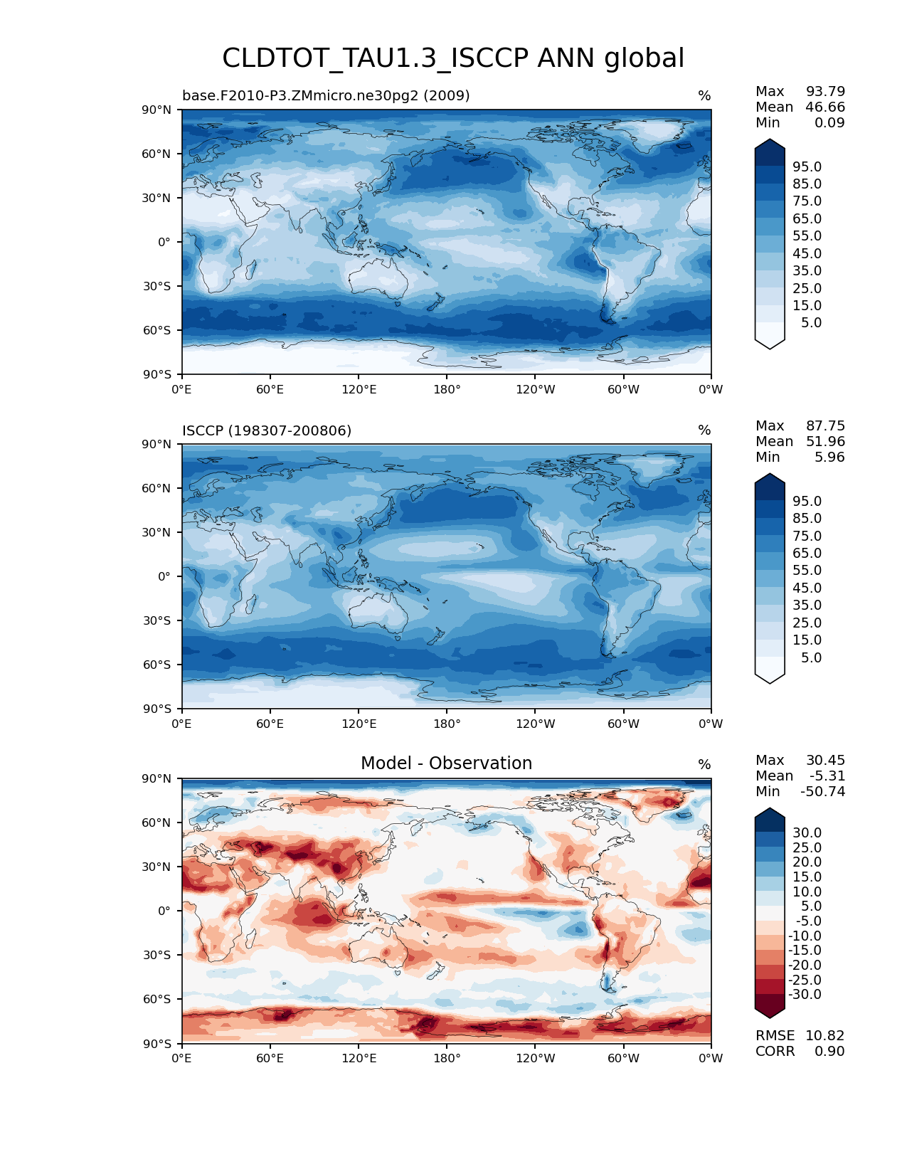 Use this command to recreate this image: | e3sm_diags lat_lon --no_viewer --case_id 'Cloud ISCCP' --sets 'lat_lon' --run_type 'model_vs_obs' --variables 'CLDTOT_TAU1.3_ISCCP' --seasons 'ANN' --regions 'global' --regrid_tool 'esmf' --regrid_method 'conservative' --main_title 'CLDTOT_TAU1.3_ISCCP ANN global' --backend 'mpl' --output_format 'png' --canvas_size_w '1212' --canvas_size_h '1628' --figsize '8.5' '11.0' --dpi '150' --arrows --contour_levels '5' '15' '25' '35' '45' '55' '65' '75' '85' '95' --test_name 'base.F2010-P3.ZMmicro.ne30pg2' --test_colormap 'Blues' --ref_name 'ISCCPCOSP' --reference_name 'ISCCP' --reference_colormap 'Blues' --diff_title 'Model - Observation' --diff_colormap 'RdBu' --diff_levels '-30' '-25' '-20' '-15' '-10' '-5' '5' '10' '15' '20' '25' '30' --num_workers '4' --granulate 'variables' 'seasons' 'plevs' 'regions' --selectors 'sets' 'seasons' --reference_data_path '/global/cfs/cdirs/e3sm/acme_diags/obs_for_e3sm_diags/climatology/' --test_data_path '/global/cscratch1/sd/xsongsio/E3SM_simulations/base.F2010-P3.ZMmicro.ne30pg2/diag/clim_rgr/1yr/' --results_dir '/global/cfs/cdirs/e3sm/www/xsongsio/base.F2010-P3.ZMmicro.ne30pg2/1yr' |