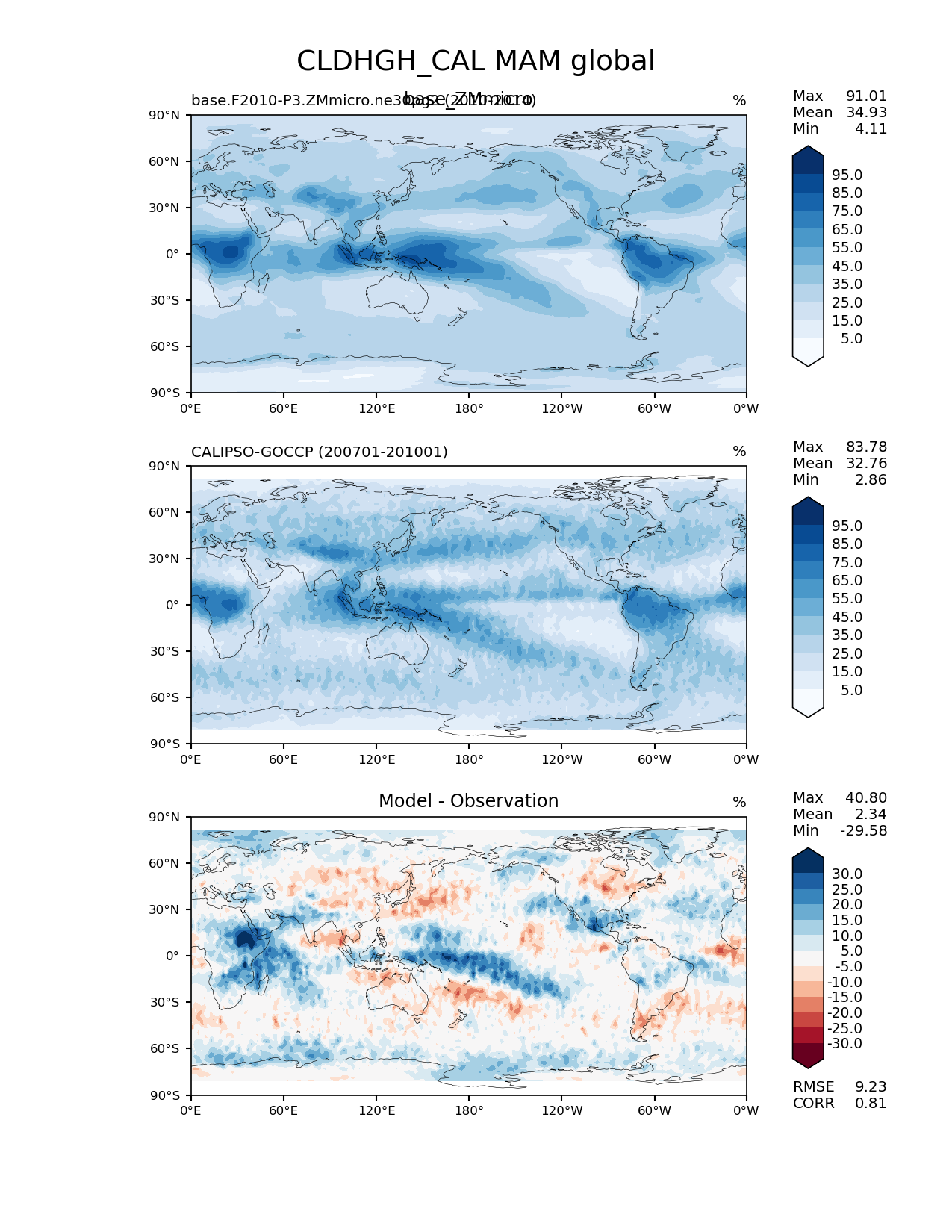 Use this command to recreate this image: | e3sm_diags lat_lon --no_viewer --case_id 'Cloud Calipso' --sets 'lat_lon' --run_type 'model_vs_obs' --variables 'CLDHGH_CAL' --seasons 'MAM' --regions 'global' --regrid_tool 'esmf' --regrid_method 'conservative' --main_title 'CLDHGH_CAL MAM global' --backend 'mpl' --output_format 'png' --canvas_size_w '1212' --canvas_size_h '1628' --figsize '8.5' '11.0' --dpi '150' --arrows --contour_levels '5' '15' '25' '35' '45' '55' '65' '75' '85' '95' --test_name 'base.F2010-P3.ZMmicro.ne30pg2' --test_title 'base_ZMmicro' --test_colormap 'Blues' --ref_name 'CALIPSOCOSP' --reference_name 'CALIPSO-GOCCP' --reference_colormap 'Blues' --diff_title 'Model - Observation' --diff_colormap 'RdBu' --diff_levels '-30' '-25' '-20' '-15' '-10' '-5' '5' '10' '15' '20' '25' '30' --num_workers '4' --granulate 'variables' 'seasons' 'plevs' 'regions' --selectors 'sets' 'seasons' --reference_data_path '/global/cfs/cdirs/e3sm/acme_diags/obs_for_e3sm_diags/climatology/' --test_data_path '/global/cscratch1/sd/xsongsio/E3SM_simulations/base.F2010-P3.ZMmicro.ne30pg2/diag/clim_rgr/5yr/' --results_dir '/global/cfs/cdirs/e3sm/www/xsongsio/base.F2010-P3.ZMmicro.ne30pg2/5yr' |