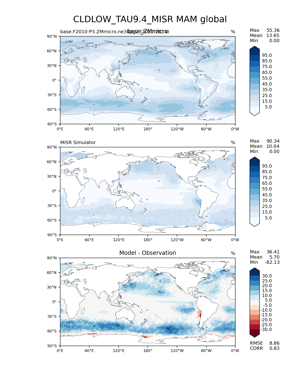 Use this command to recreate this image: | e3sm_diags lat_lon --no_viewer --case_id 'Cloud MISR' --sets 'lat_lon' --run_type 'model_vs_obs' --variables 'CLDLOW_TAU9.4_MISR' --seasons 'MAM' --regions 'global' --regrid_tool 'esmf' --regrid_method 'conservative' --main_title 'CLDLOW_TAU9.4_MISR MAM global' --backend 'mpl' --output_format 'png' --canvas_size_w '1212' --canvas_size_h '1628' --figsize '8.5' '11.0' --dpi '150' --arrows --contour_levels '5' '15' '25' '35' '45' '55' '65' '75' '85' '95' --test_name 'base.F2010-P3.ZMmicro.ne30pg2' --test_title 'base_ZMmicro' --test_colormap 'Blues' --ref_name 'MISRCOSP' --reference_name 'MISR Simulator' --reference_colormap 'Blues' --diff_title 'Model - Observation' --diff_colormap 'RdBu' --diff_levels '-30' '-25' '-20' '-15' '-10' '-5' '5' '10' '15' '20' '25' '30' --num_workers '4' --granulate 'variables' 'seasons' 'plevs' 'regions' --selectors 'sets' 'seasons' --reference_data_path '/global/cfs/cdirs/e3sm/acme_diags/obs_for_e3sm_diags/climatology/' --test_data_path '/global/cscratch1/sd/xsongsio/E3SM_simulations/base.F2010-P3.ZMmicro.ne30pg2/diag/clim_rgr/5yr/' --results_dir '/global/cfs/cdirs/e3sm/www/xsongsio/base.F2010-P3.ZMmicro.ne30pg2/5yr' |