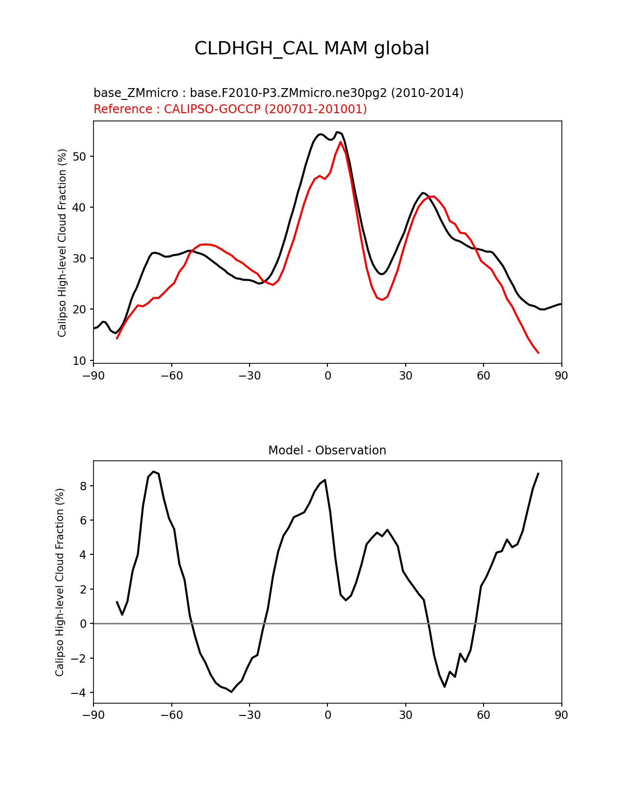 Use this command to recreate this image: | e3sm_diags zonal_mean_xy --no_viewer --case_id 'Cloud Calipso' --sets 'zonal_mean_xy' --run_type 'model_vs_obs' --variables 'CLDHGH_CAL' --seasons 'MAM' --regions 'global' --regrid_tool 'esmf' --regrid_method 'conservative' --main_title 'CLDHGH_CAL MAM global' --backend 'mpl' --output_format 'png' --canvas_size_w '1212' --canvas_size_h '1628' --figsize '8.5' '11.0' --dpi '150' --arrows --test_name 'base.F2010-P3.ZMmicro.ne30pg2' --test_title 'base_ZMmicro' --test_colormap 'cet_rainbow.rgb' --ref_name 'CALIPSOCOSP' --reference_name 'CALIPSO-GOCCP' --reference_colormap 'cet_rainbow.rgb' --diff_title 'Model - Observation' --diff_colormap 'diverging_bwr.rgb' --num_workers '4' --granulate 'variables' 'seasons' 'plevs' 'regions' --selectors 'sets' 'seasons' --reference_data_path '/global/cfs/cdirs/e3sm/acme_diags/obs_for_e3sm_diags/climatology/' --test_data_path '/global/cscratch1/sd/xsongsio/E3SM_simulations/base.F2010-P3.ZMmicro.ne30pg2/diag/clim_rgr/5yr/' --results_dir '/global/cfs/cdirs/e3sm/www/xsongsio/base.F2010-P3.ZMmicro.ne30pg2/5yr' |