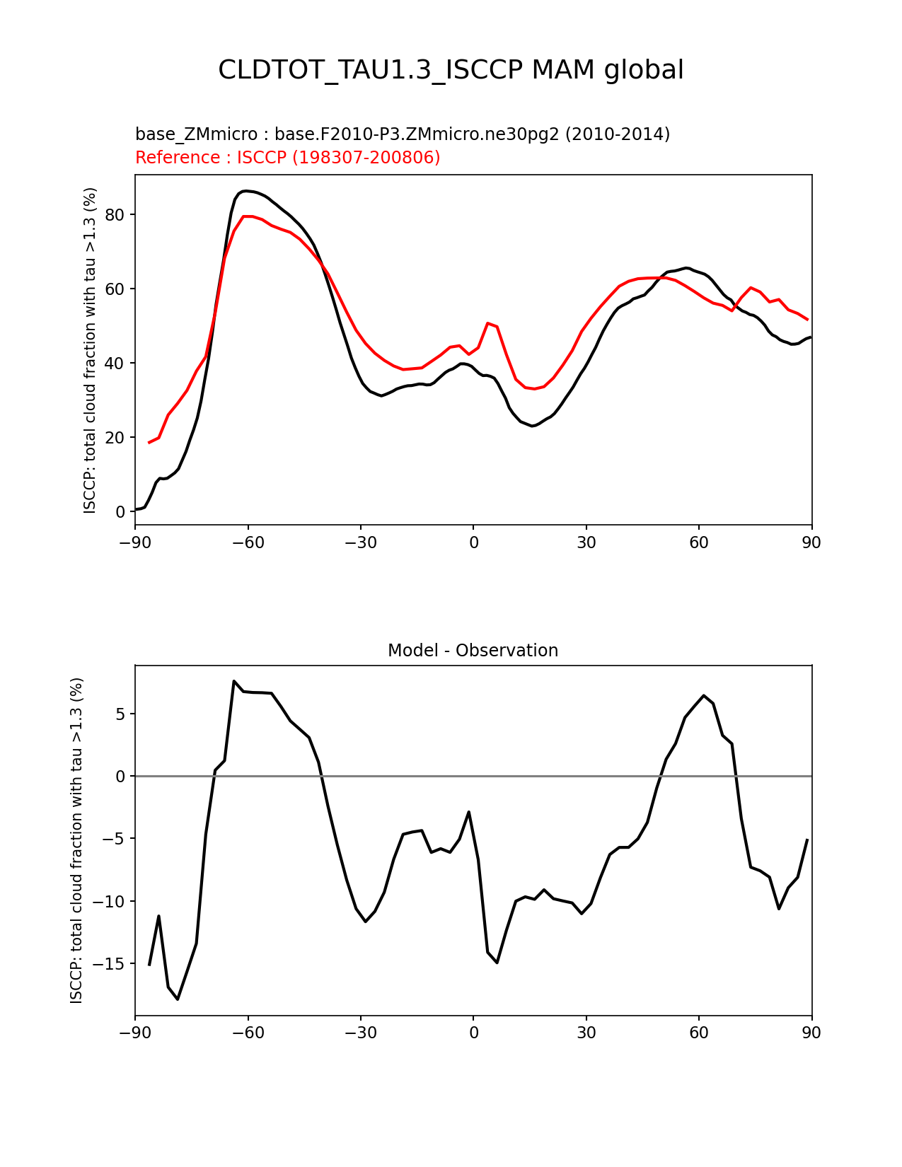 Use this command to recreate this image: | e3sm_diags zonal_mean_xy --no_viewer --case_id 'Cloud ISCCP' --sets 'zonal_mean_xy' --run_type 'model_vs_obs' --variables 'CLDTOT_TAU1.3_ISCCP' --seasons 'MAM' --regions 'global' --regrid_tool 'esmf' --regrid_method 'conservative' --main_title 'CLDTOT_TAU1.3_ISCCP MAM global' --backend 'mpl' --output_format 'png' --canvas_size_w '1212' --canvas_size_h '1628' --figsize '8.5' '11.0' --dpi '150' --arrows --test_name 'base.F2010-P3.ZMmicro.ne30pg2' --test_title 'base_ZMmicro' --test_colormap 'cet_rainbow.rgb' --ref_name 'ISCCPCOSP' --reference_name 'ISCCP' --reference_colormap 'cet_rainbow.rgb' --diff_title 'Model - Observation' --diff_colormap 'diverging_bwr.rgb' --num_workers '4' --granulate 'variables' 'seasons' 'plevs' 'regions' --selectors 'sets' 'seasons' --reference_data_path '/global/cfs/cdirs/e3sm/acme_diags/obs_for_e3sm_diags/climatology/' --test_data_path '/global/cscratch1/sd/xsongsio/E3SM_simulations/base.F2010-P3.ZMmicro.ne30pg2/diag/clim_rgr/5yr/' --results_dir '/global/cfs/cdirs/e3sm/www/xsongsio/base.F2010-P3.ZMmicro.ne30pg2/5yr' |