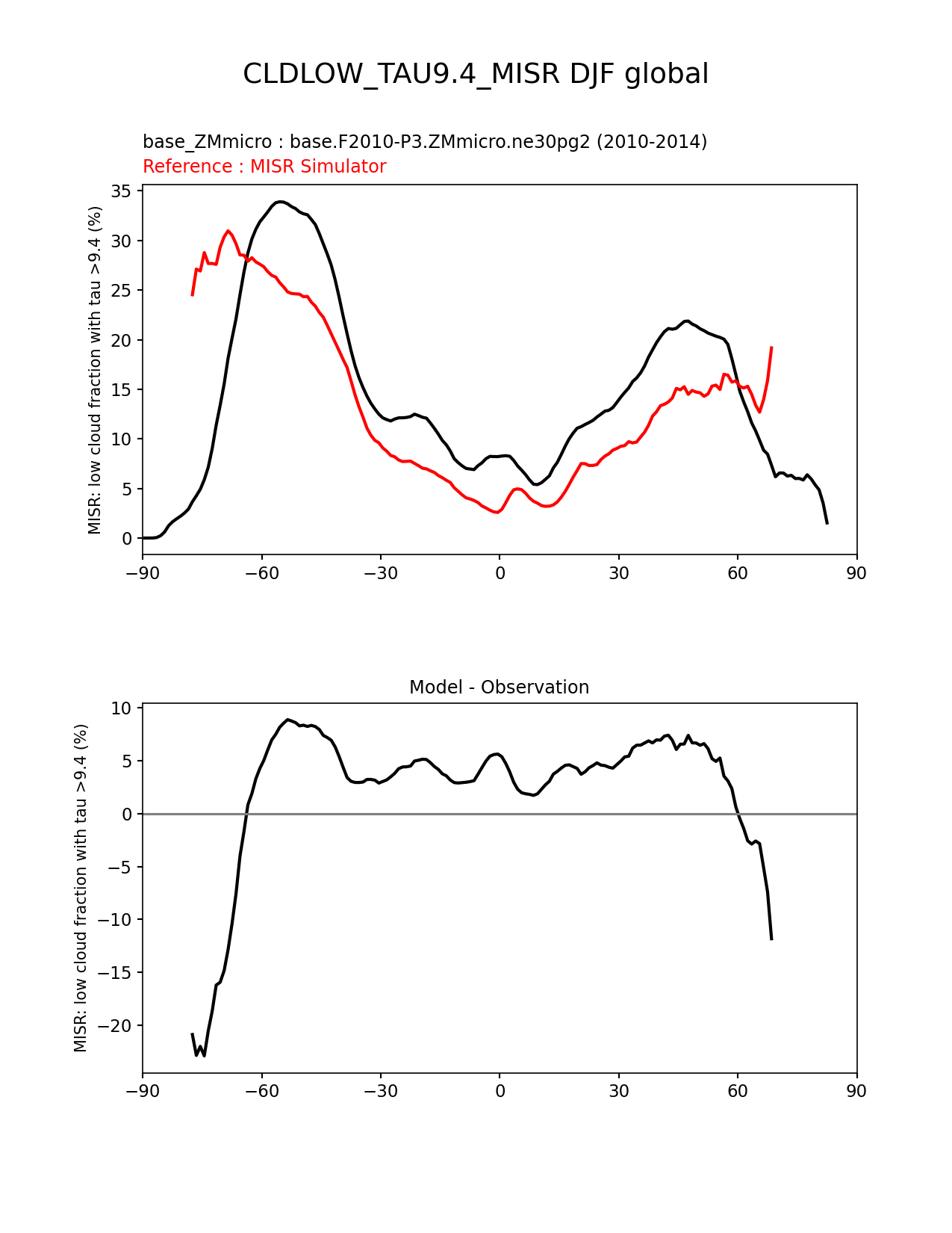 Use this command to recreate this image: | e3sm_diags zonal_mean_xy --no_viewer --case_id 'Cloud MISR' --sets 'zonal_mean_xy' --run_type 'model_vs_obs' --variables 'CLDLOW_TAU9.4_MISR' --seasons 'DJF' --regions 'global' --regrid_tool 'esmf' --regrid_method 'conservative' --main_title 'CLDLOW_TAU9.4_MISR DJF global' --backend 'mpl' --output_format 'png' --canvas_size_w '1212' --canvas_size_h '1628' --figsize '8.5' '11.0' --dpi '150' --arrows --test_name 'base.F2010-P3.ZMmicro.ne30pg2' --test_title 'base_ZMmicro' --test_colormap 'cet_rainbow.rgb' --ref_name 'MISRCOSP' --reference_name 'MISR Simulator' --reference_colormap 'cet_rainbow.rgb' --diff_title 'Model - Observation' --diff_colormap 'diverging_bwr.rgb' --num_workers '4' --granulate 'variables' 'seasons' 'plevs' 'regions' --selectors 'sets' 'seasons' --reference_data_path '/global/cfs/cdirs/e3sm/acme_diags/obs_for_e3sm_diags/climatology/' --test_data_path '/global/cscratch1/sd/xsongsio/E3SM_simulations/base.F2010-P3.ZMmicro.ne30pg2/diag/clim_rgr/5yr/' --results_dir '/global/cfs/cdirs/e3sm/www/xsongsio/base.F2010-P3.ZMmicro.ne30pg2/5yr' |